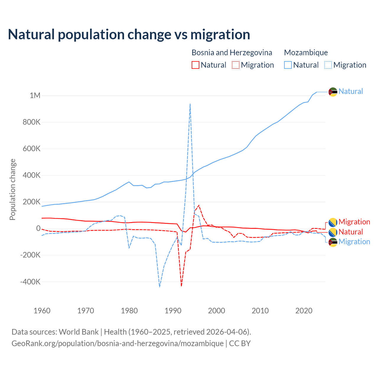 Over the last 10 years, 41.1% of the population change in Bosnia and Herzegovina is from natural causes (a loss of 169,384 people) and 58.9% is from migration (a loss of 243,117 people). In Mozambique 95.9% is from natural causes (a gain of 9,108,203 people) and 4.15% is from migration (a loss of 393,923 people).