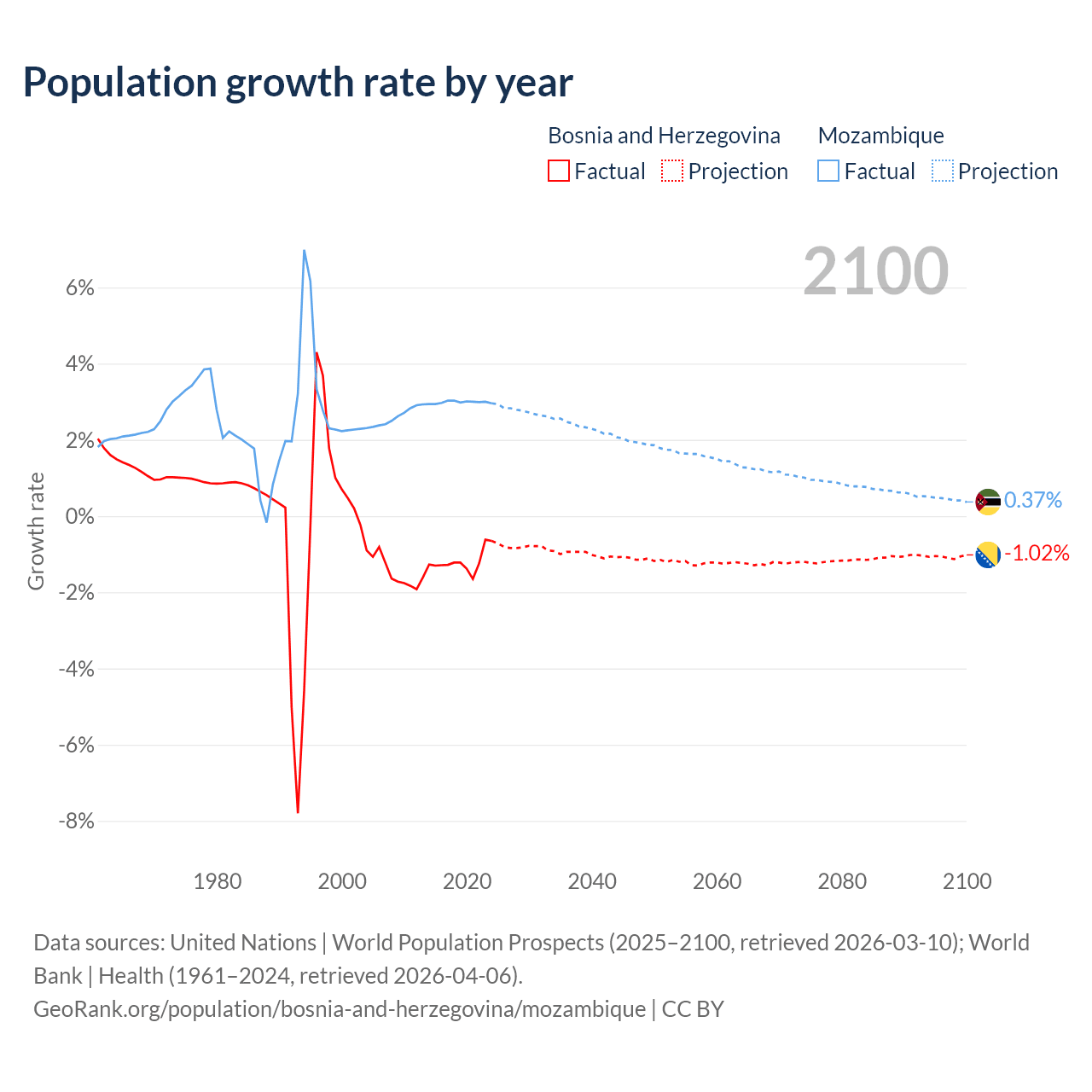 - For the last 10 years, Bosnia and Herzegovina has had an average growth rate of -1.19% per year vs +2.99% in Mozambique.
