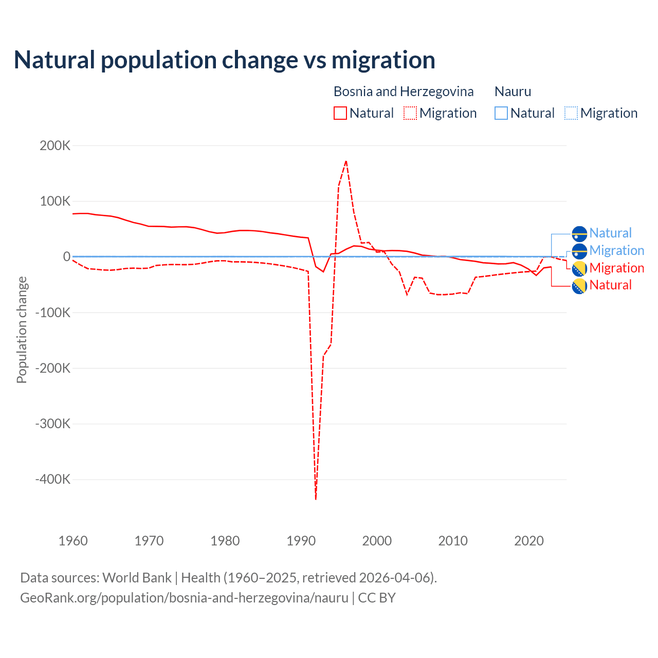 Over the last 10 years, 41.1% of the population change in Bosnia and Herzegovina is from natural causes (a loss of 169,384 people) and 58.9% is from migration (a loss of 243,117 people). In Nauru 66.2% is from natural causes (a gain of 2,590 people) and 33.8% is from migration (a loss of 1,320 people).
