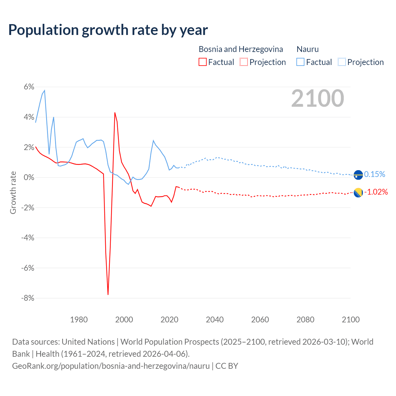 - For the last 10 years, Bosnia and Herzegovina has had an average growth rate of -1.19% per year vs +1.17% in Nauru.