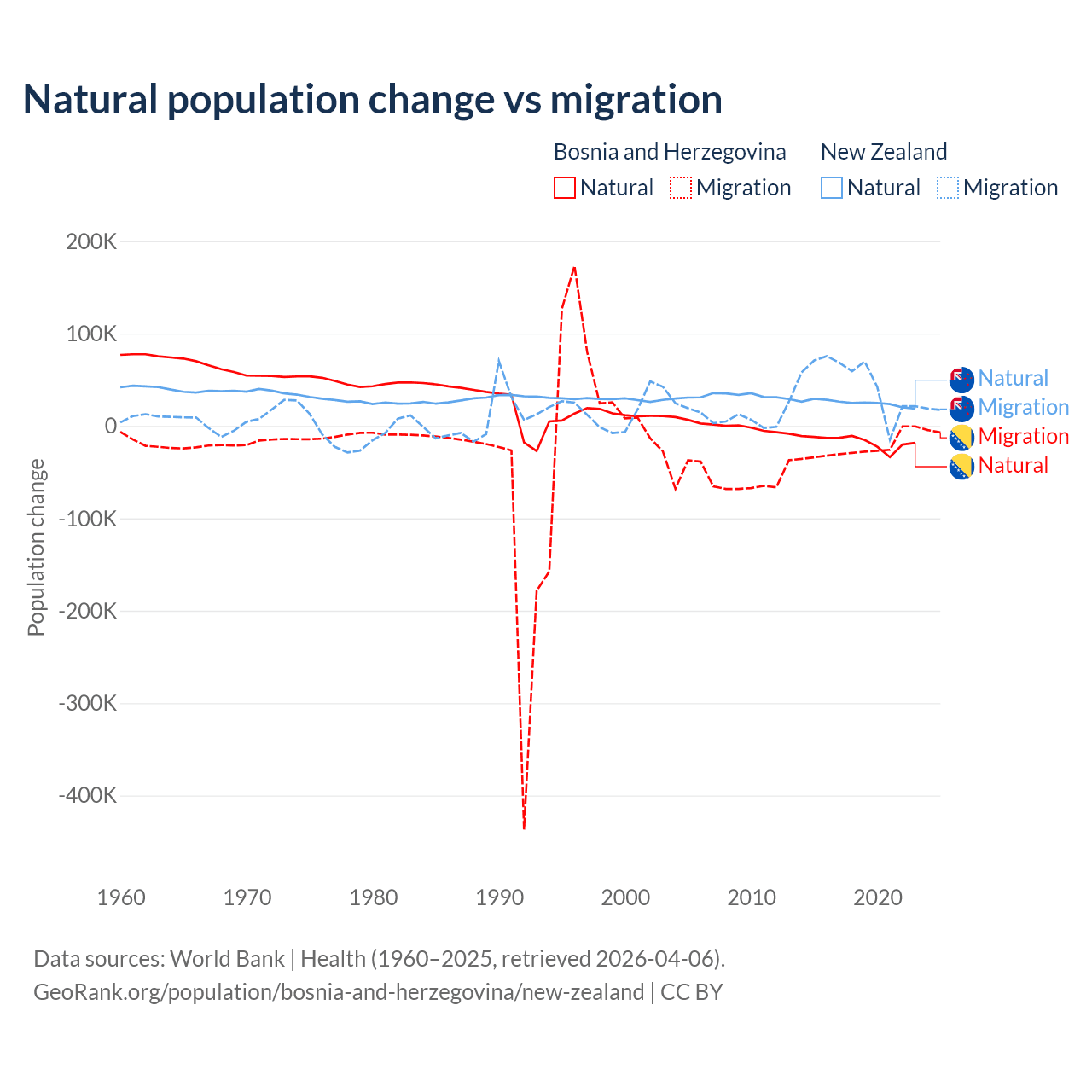 Over the last 10 years, 41.1% of the population change in Bosnia and Herzegovina is from natural causes (a loss of 169,384 people) and 58.9% is from migration (a loss of 243,117 people). In New Zealand 34.4% is from natural causes (a gain of 247,767 people) and 65.6% is from migration (a gain of 471,602 people).