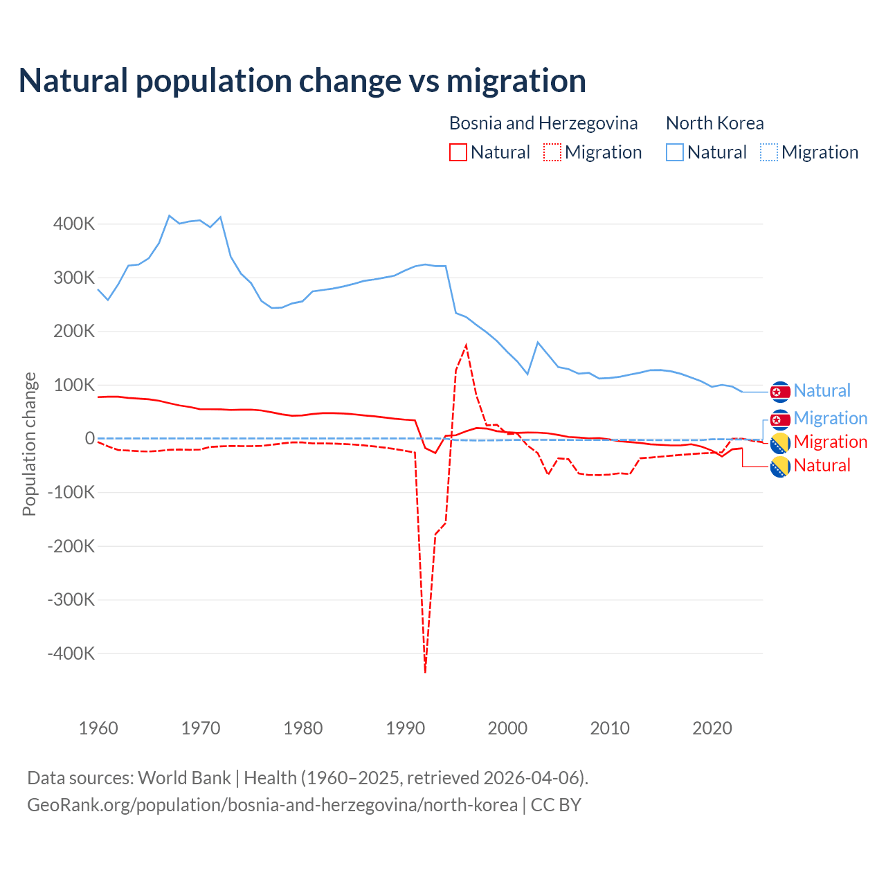 Over the last 10 years, 41.1% of the population change in Bosnia and Herzegovina is from natural causes (a loss of 169,384 people) and 58.9% is from migration (a loss of 243,117 people). In North Korea 97.7% is from natural causes (a gain of 1,097,372 people) and 2.33% is from migration (a loss of 26,227 people).