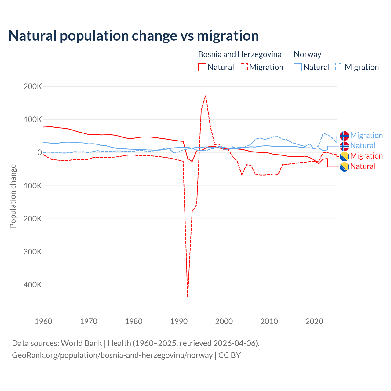 Over the last 10 years, 41.1% of the population change in Bosnia and Herzegovina is from natural causes (a loss of 169,384 people) and 58.9% is from migration (a loss of 243,117 people). In Norway 31.3% is from natural causes (a gain of 138,699 people) and 68.7% is from migration (a gain of 303,945 people).