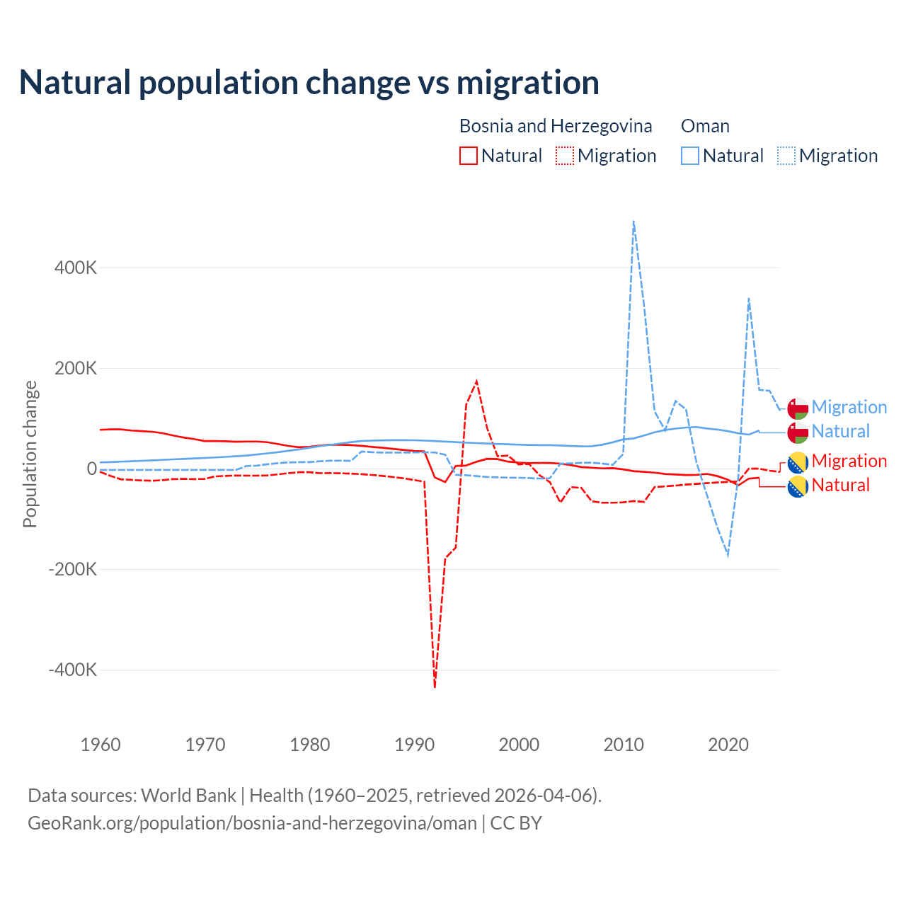 Over the last 10 years, 41.1% of the population change in Bosnia and Herzegovina is from natural causes (a loss of 169,384 people) and 58.9% is from migration (a loss of 243,117 people). In Oman 61.6% is from natural causes (a gain of 763,049 people) and 38.4% is from migration (a gain of 475,565 people).