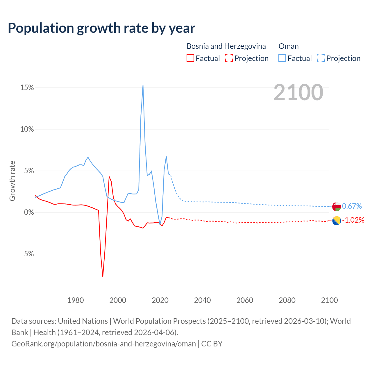 - For the last 10 years, Bosnia and Herzegovina has had an average growth rate of -1.19% per year vs +2.99% in Oman.