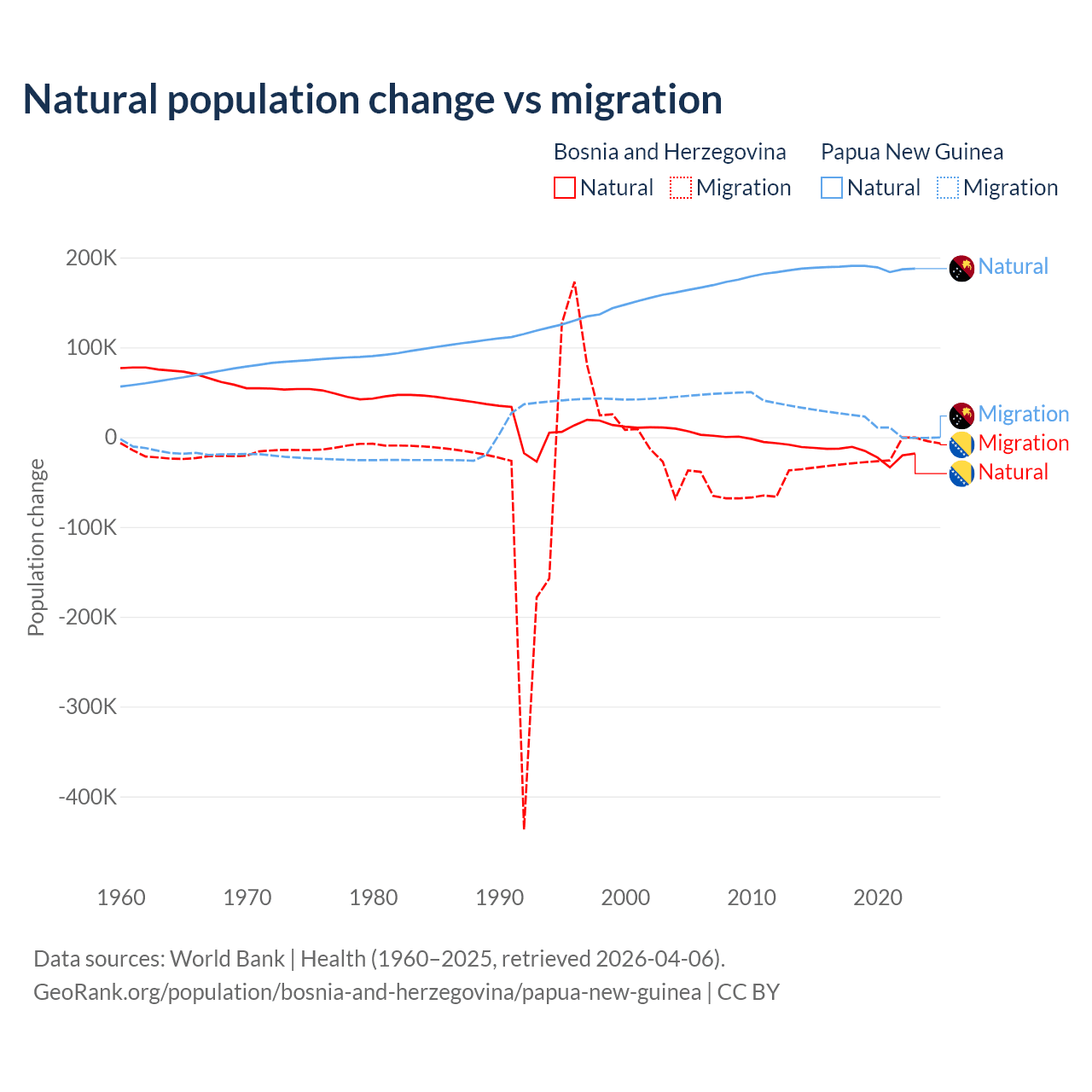 Over the last 10 years, 41.1% of the population change in Bosnia and Herzegovina is from natural causes (a loss of 169,384 people) and 58.9% is from migration (a loss of 243,117 people). In Papua New Guinea 91% is from natural causes (a gain of 1,883,906 people) and 8.98% is from migration (a gain of 185,900 people).