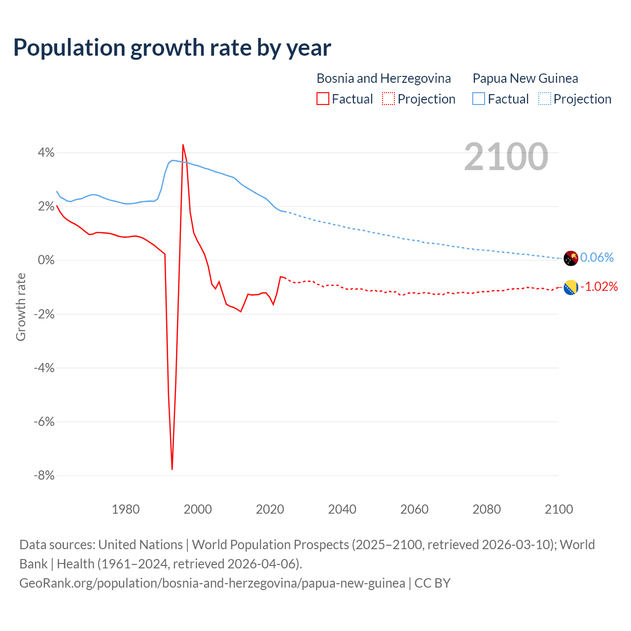 - For the last 10 years, Bosnia and Herzegovina has had an average growth rate of -1.19% per year vs +2.23% in Papua New Guinea.