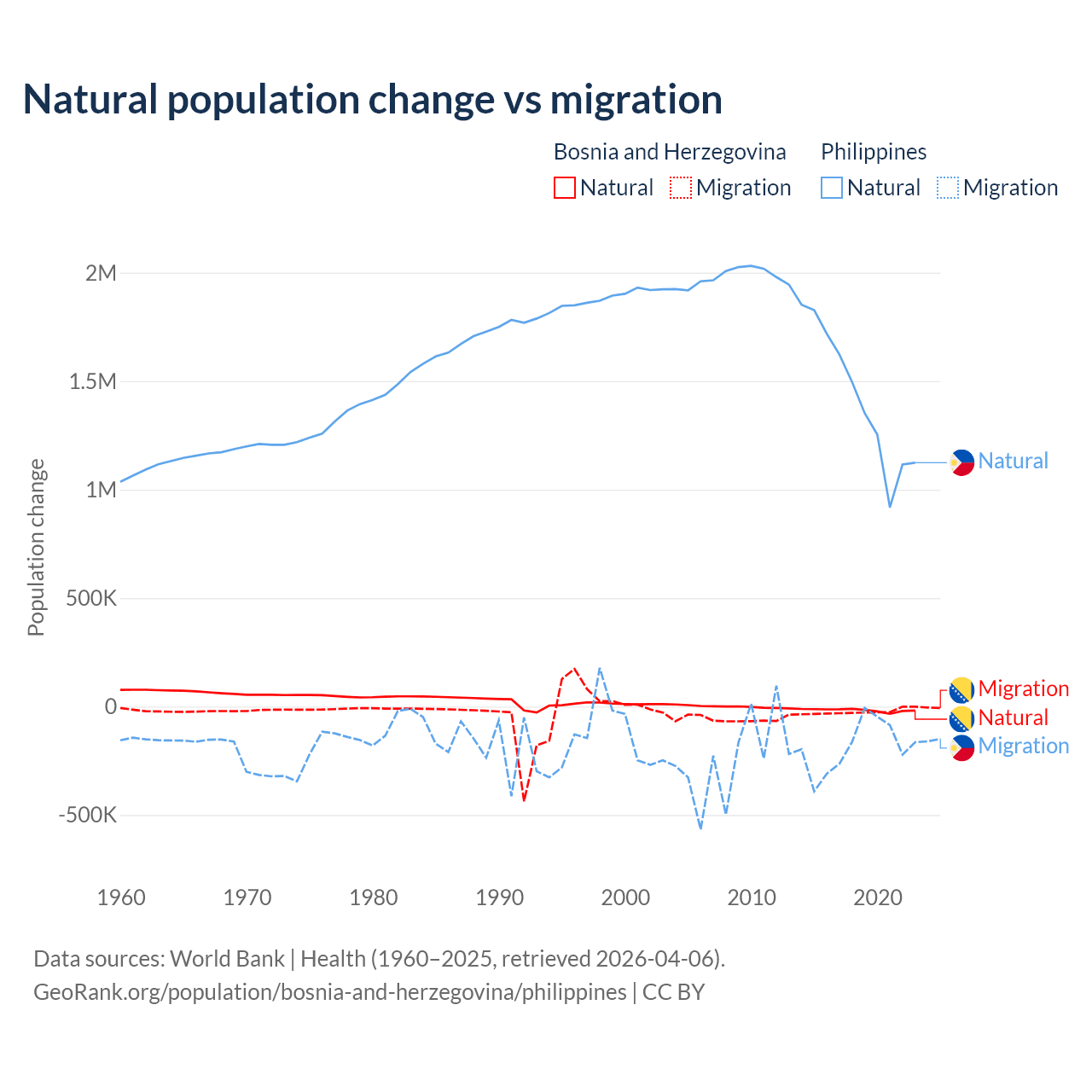 Over the last 10 years, 41.1% of the population change in Bosnia and Herzegovina is from natural causes (a loss of 169,384 people) and 58.9% is from migration (a loss of 243,117 people). In the Philippines 88.5% is from natural causes (a gain of 14,279,705 people) and 11.5% is from migration (a loss of 1,848,117 people).