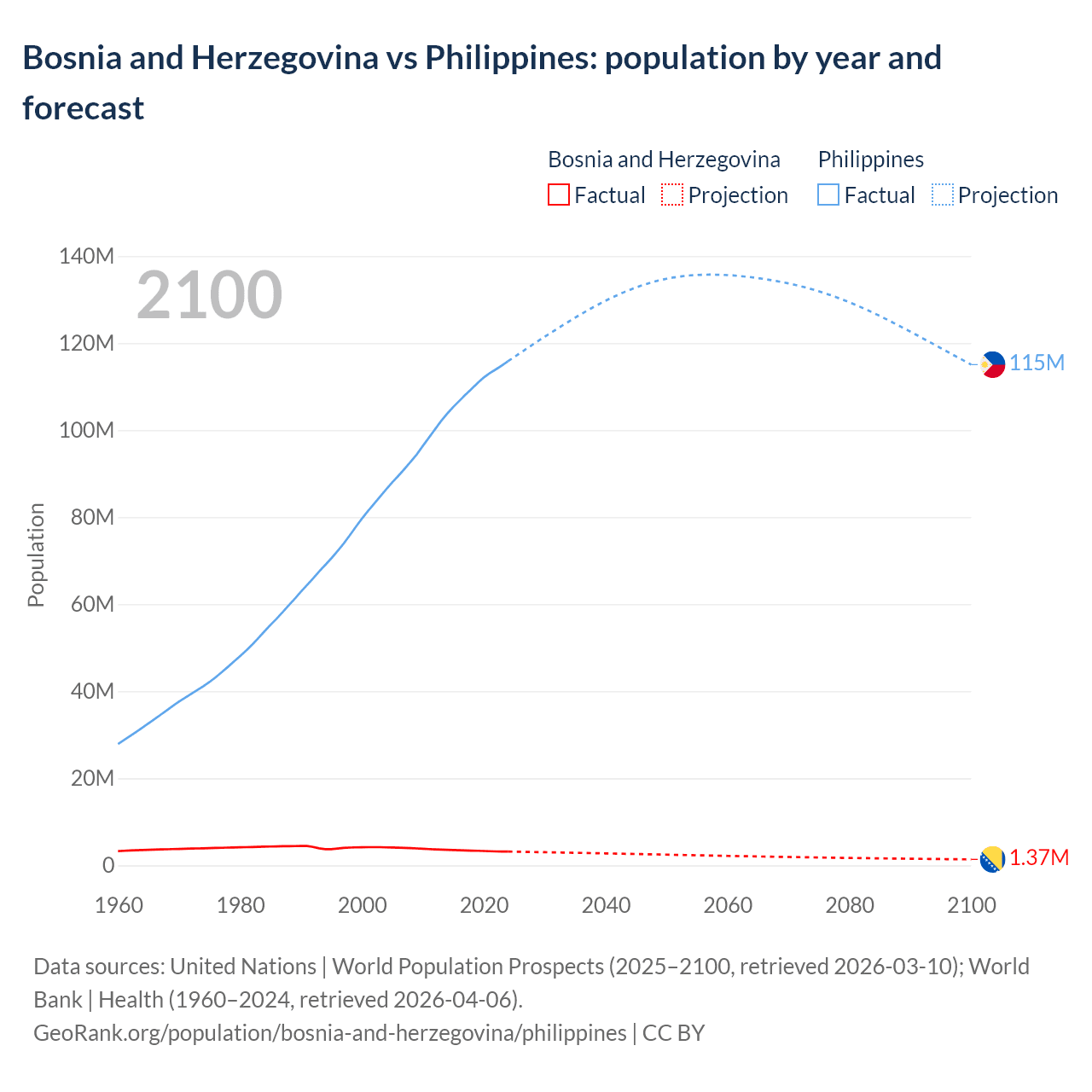 Bosnia and Herzegovina vs Philippines: population by year and forecast