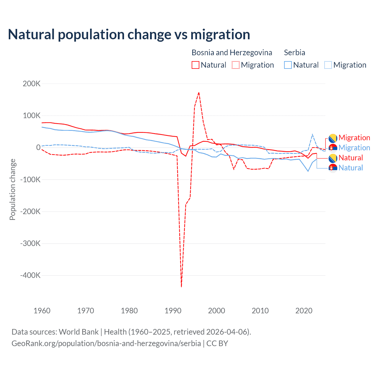 Over the last 10 years, 41.1% of the population change in Bosnia and Herzegovina is from natural causes (a loss of 169,384 people) and 58.9% is from migration (a loss of 243,117 people). In Serbia 83.3% is from natural causes (a loss of 435,148 people) and 16.7% is from migration (a loss of 87,110 people).