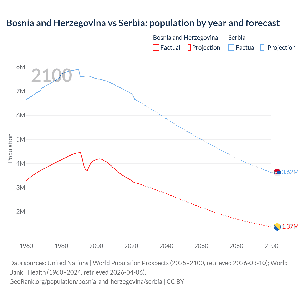 Bosnia and Herzegovina vs Serbia: population by year and forecast