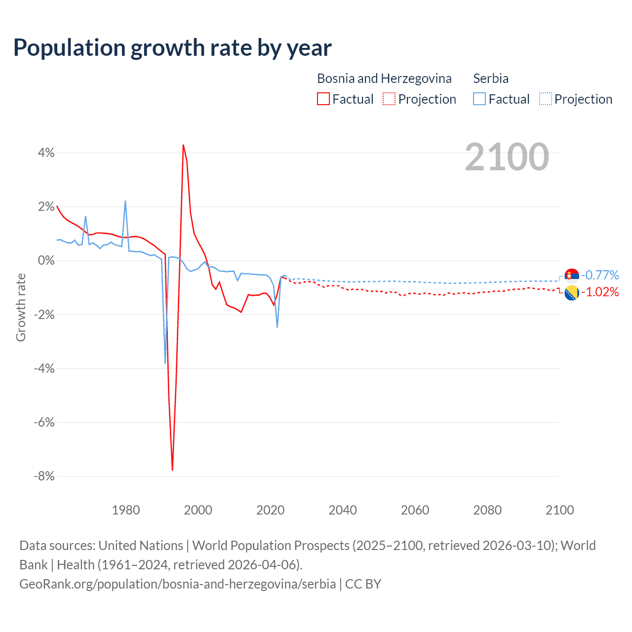 - For the last 10 years, Bosnia and Herzegovina has had an average growth rate of -1.19% per year vs -0.76% in Serbia.