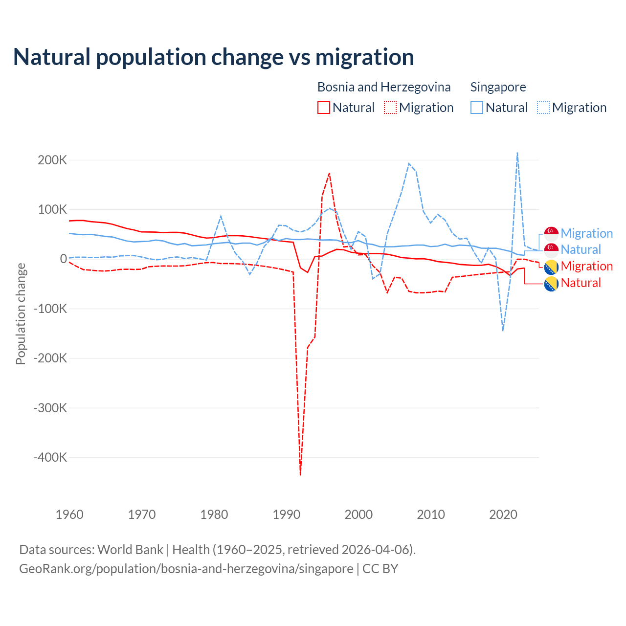 Over the last 10 years, 41.1% of the population change in Bosnia and Herzegovina is from natural causes (a loss of 169,384 people) and 58.9% is from migration (a loss of 243,117 people). In Singapore 54.8% is from natural causes (a gain of 195,953 people) and 45.2% is from migration (a gain of 161,805 people).
