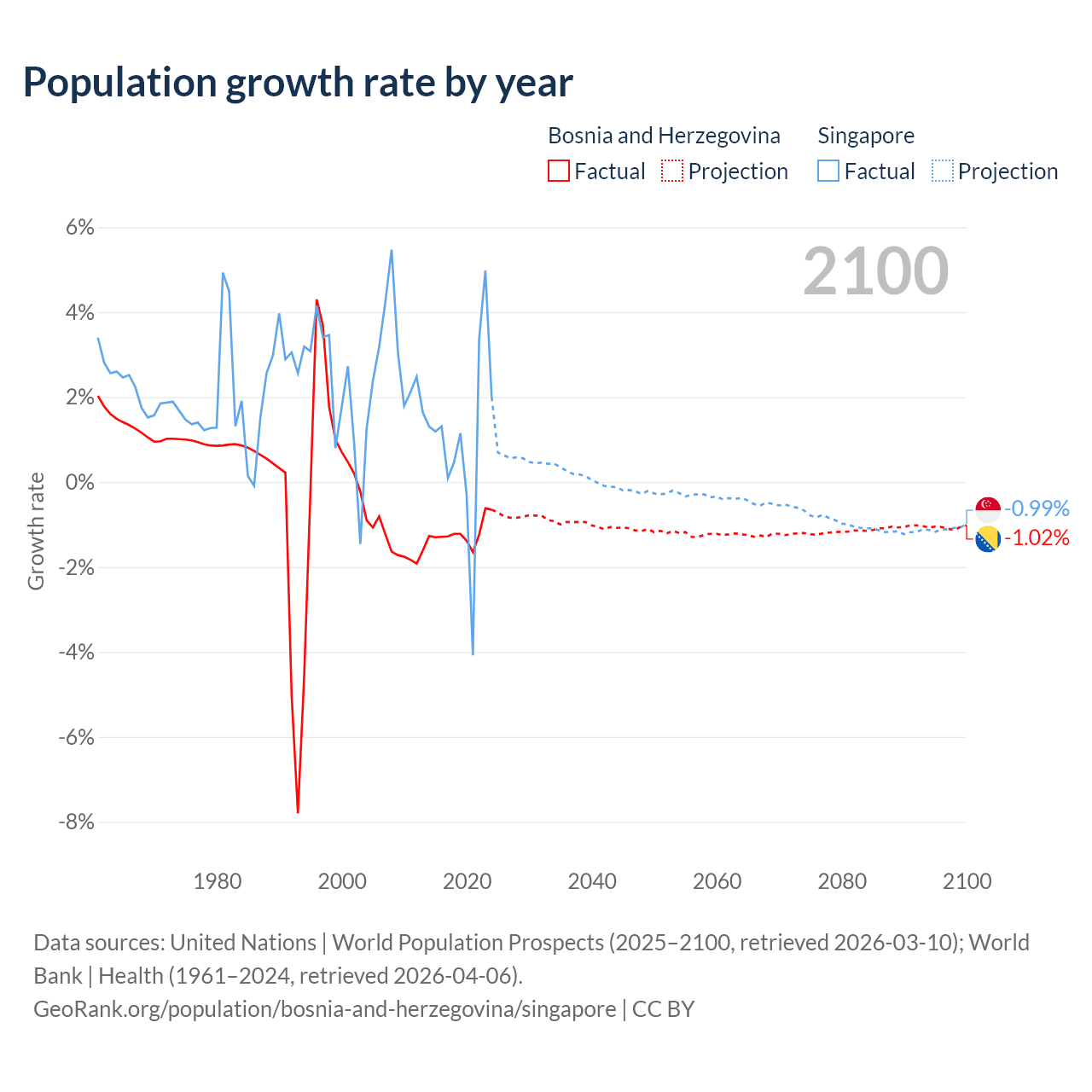 - For the last 10 years, Bosnia and Herzegovina has had an average growth rate of -1.19% per year vs +1.04% in Singapore.