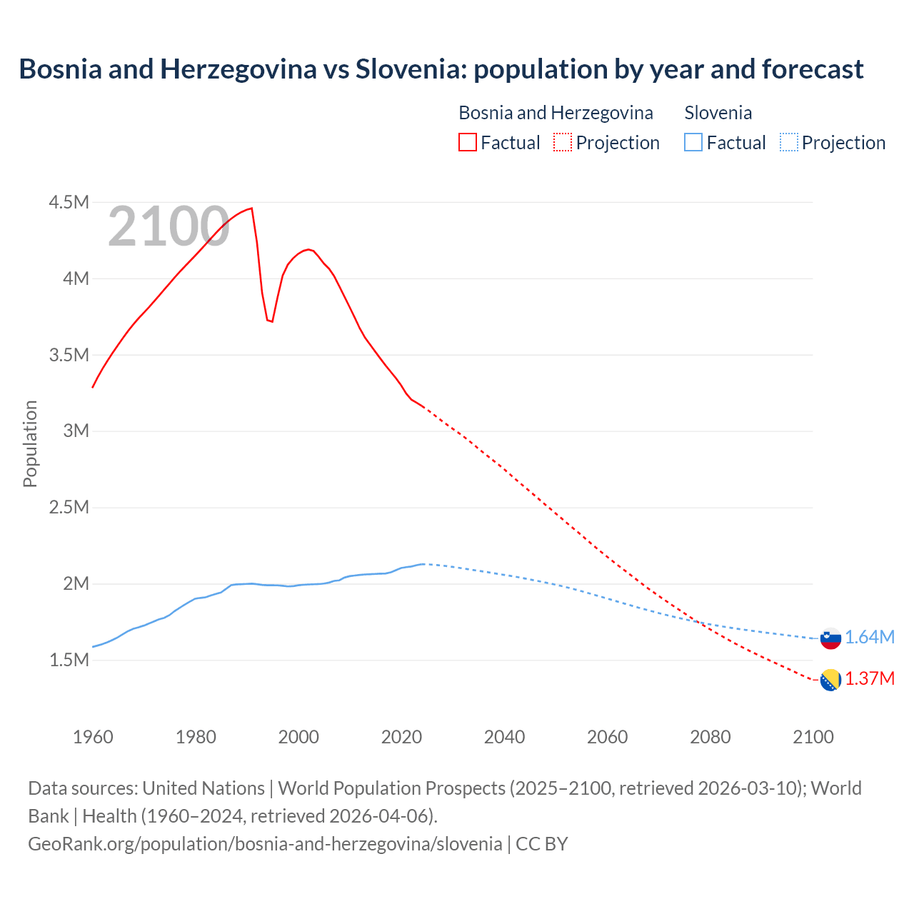 The latest officially reported population of Bosnia and Herzegovina was 3,164,253 in 2024 vs 2,127,400 people in Slovenia in 2024. In 2026, based on the adjusted UN estimation, the current Bosnia and Herzegovina's population is 3,116,111 people compared to 2,124,138 in Slovenia.