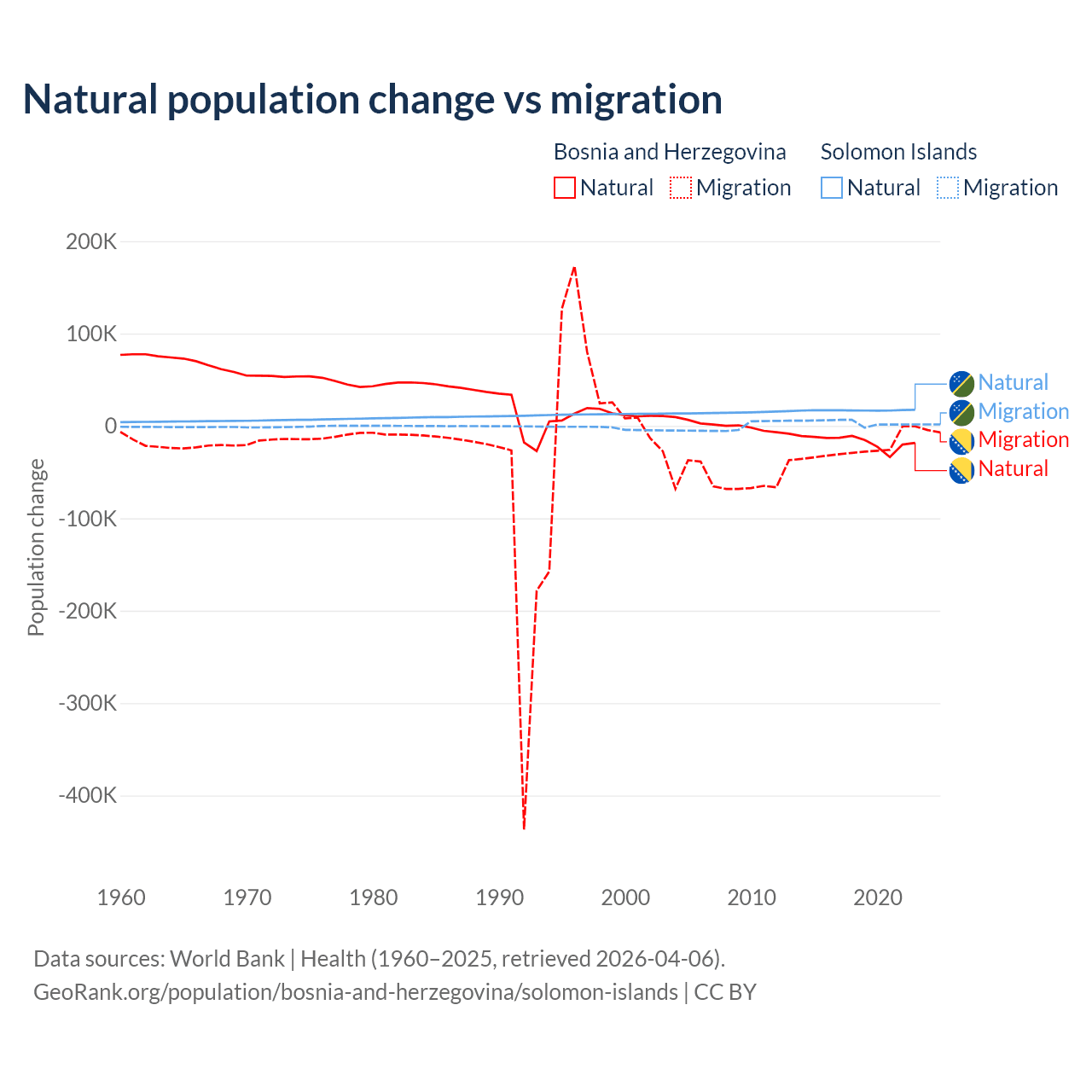 Over the last 10 years, 41.1% of the population change in Bosnia and Herzegovina is from natural causes (a loss of 169,384 people) and 58.9% is from migration (a loss of 243,117 people). In the Solomon Islands 82.8% is from natural causes (a gain of 168,727 people) and 17.2% is from migration (a gain of 35,031 people).