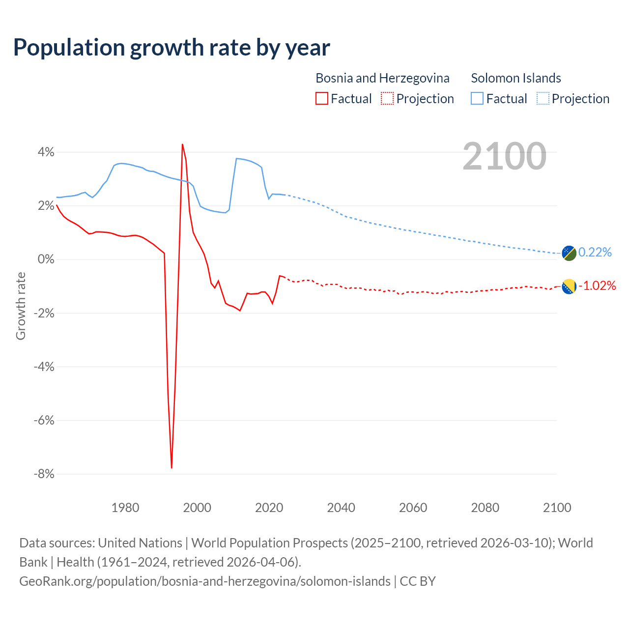 - For the last 10 years, Bosnia and Herzegovina has had an average growth rate of -1.19% per year vs +2.95% in the Solomon Islands.