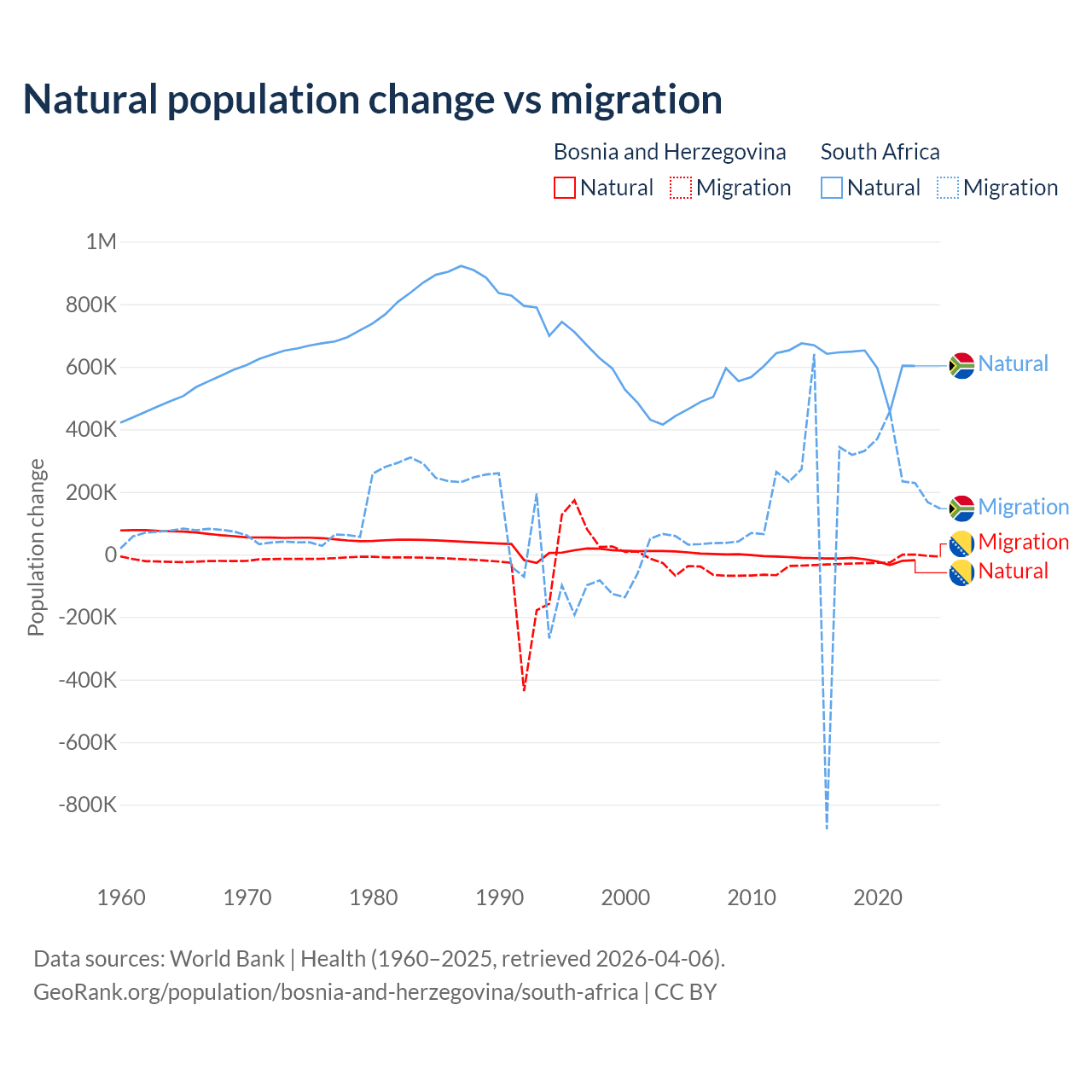 Over the last 10 years, 41.1% of the population change in Bosnia and Herzegovina is from natural causes (a loss of 169,384 people) and 58.9% is from migration (a loss of 243,117 people). In South Africa 72.8% is from natural causes (a gain of 6,190,027 people) and 27.2% is from migration (a gain of 2,316,795 people).