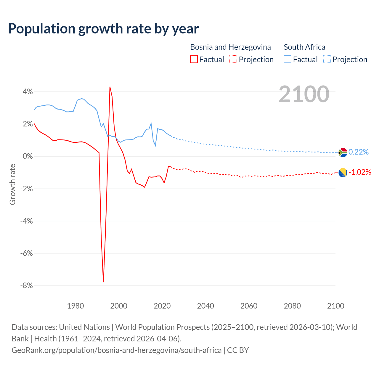 - For the last 10 years, Bosnia and Herzegovina has had an average growth rate of -1.19% per year vs +1.44% in South Africa.