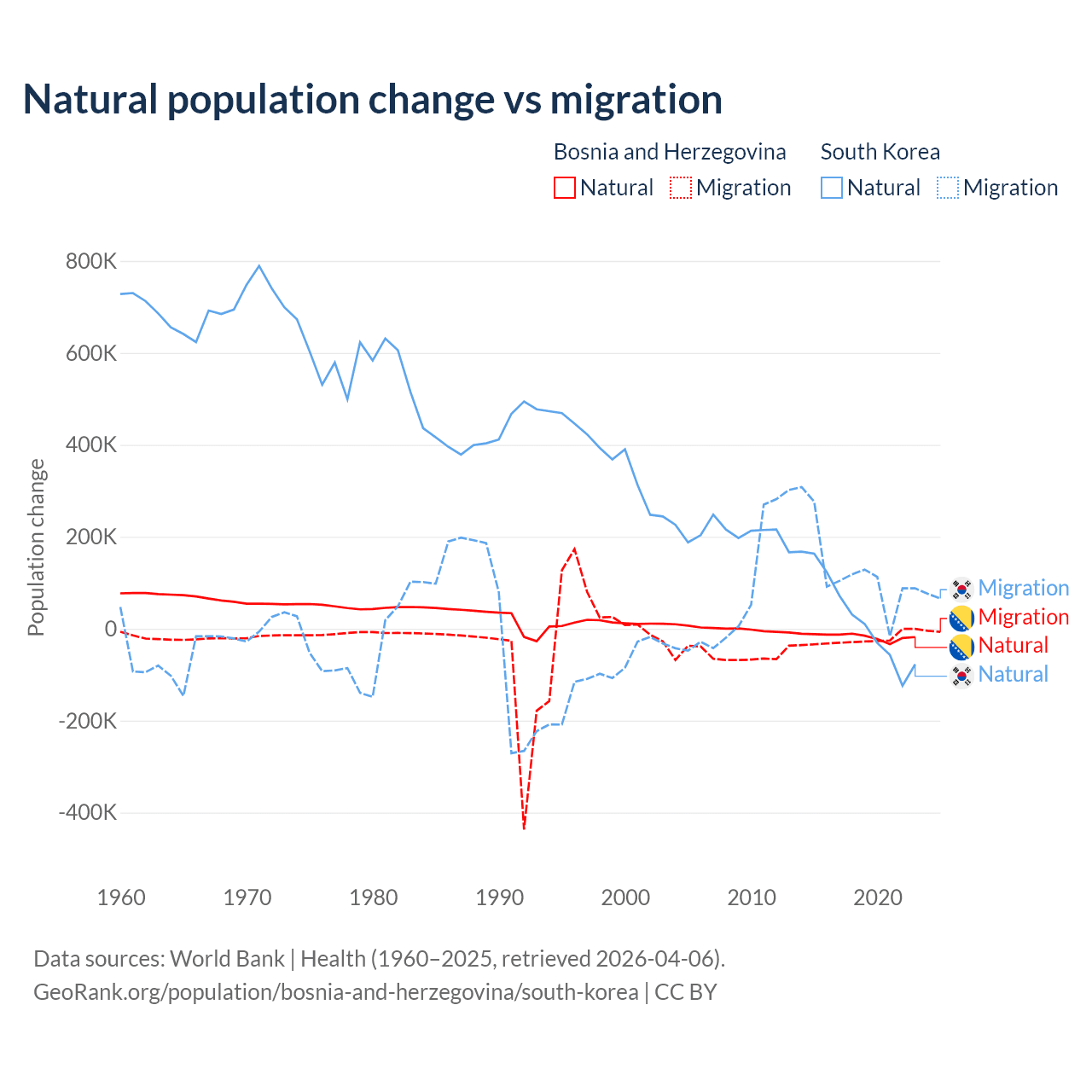 Over the last 10 years, 41.1% of the population change in Bosnia and Herzegovina is from natural causes (a loss of 169,384 people) and 58.9% is from migration (a loss of 243,117 people). In South Korea 17.6% is from natural causes (a gain of 277,215 people) and 82.4% is from migration (a gain of 1,298,356 people).