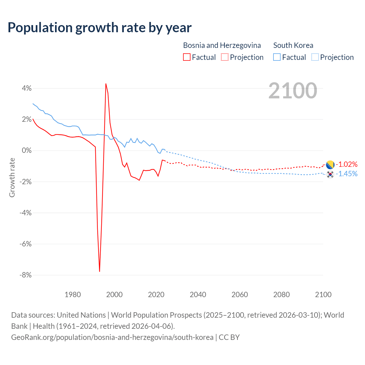 - For the last 10 years, Bosnia and Herzegovina has had an average growth rate of -1.19% per year vs +0.24% in South Korea.