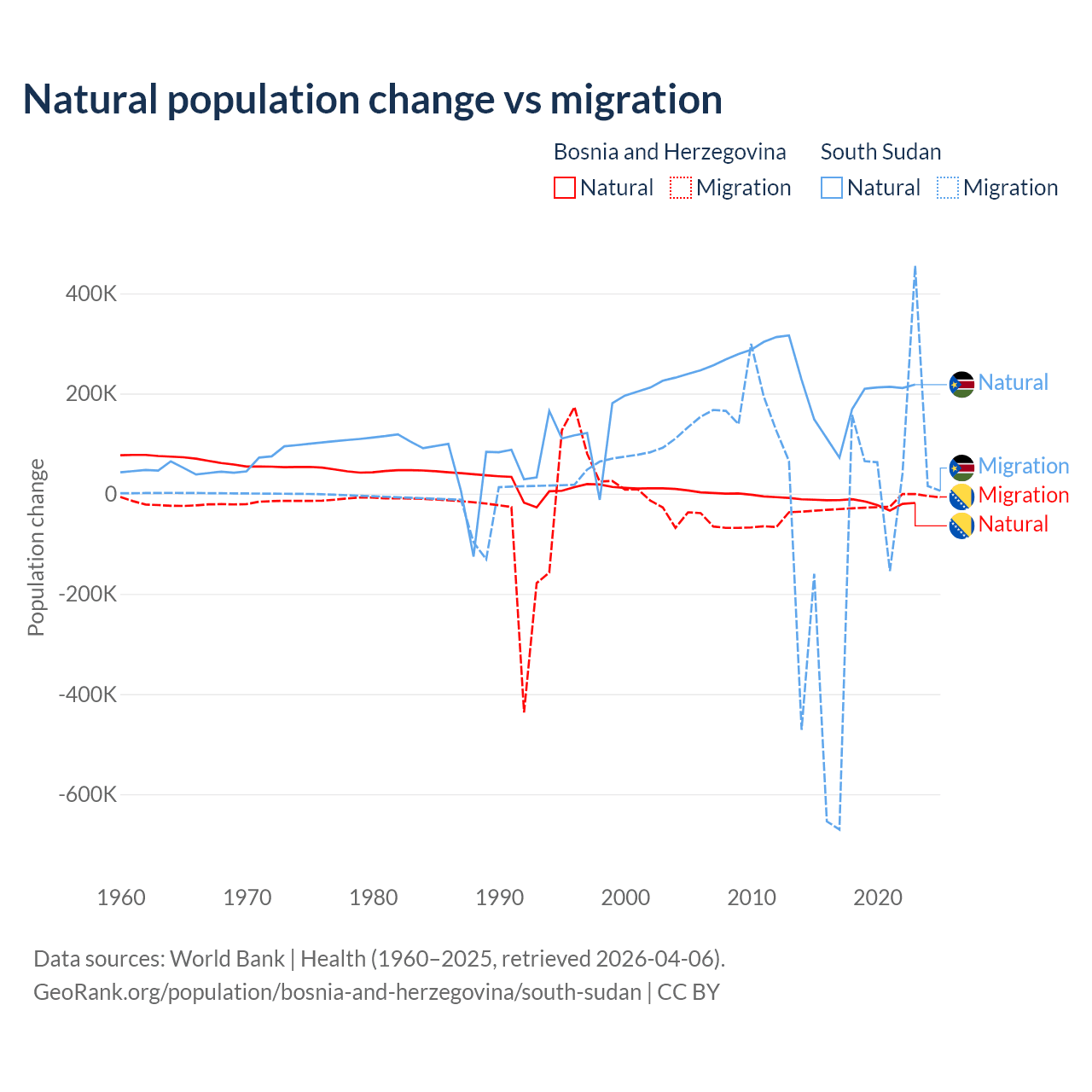 Over the last 10 years, 41.1% of the population change in Bosnia and Herzegovina is from natural causes (a loss of 169,384 people) and 58.9% is from migration (a loss of 243,117 people). In South Sudan 57.4% is from natural causes (a gain of 1,792,135 people) and 42.6% is from migration (a loss of 1,329,606 people).