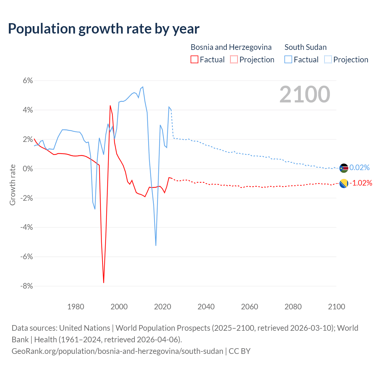 - For the last 10 years, Bosnia and Herzegovina has had an average growth rate of -1.19% per year vs +0.65% in South Sudan.