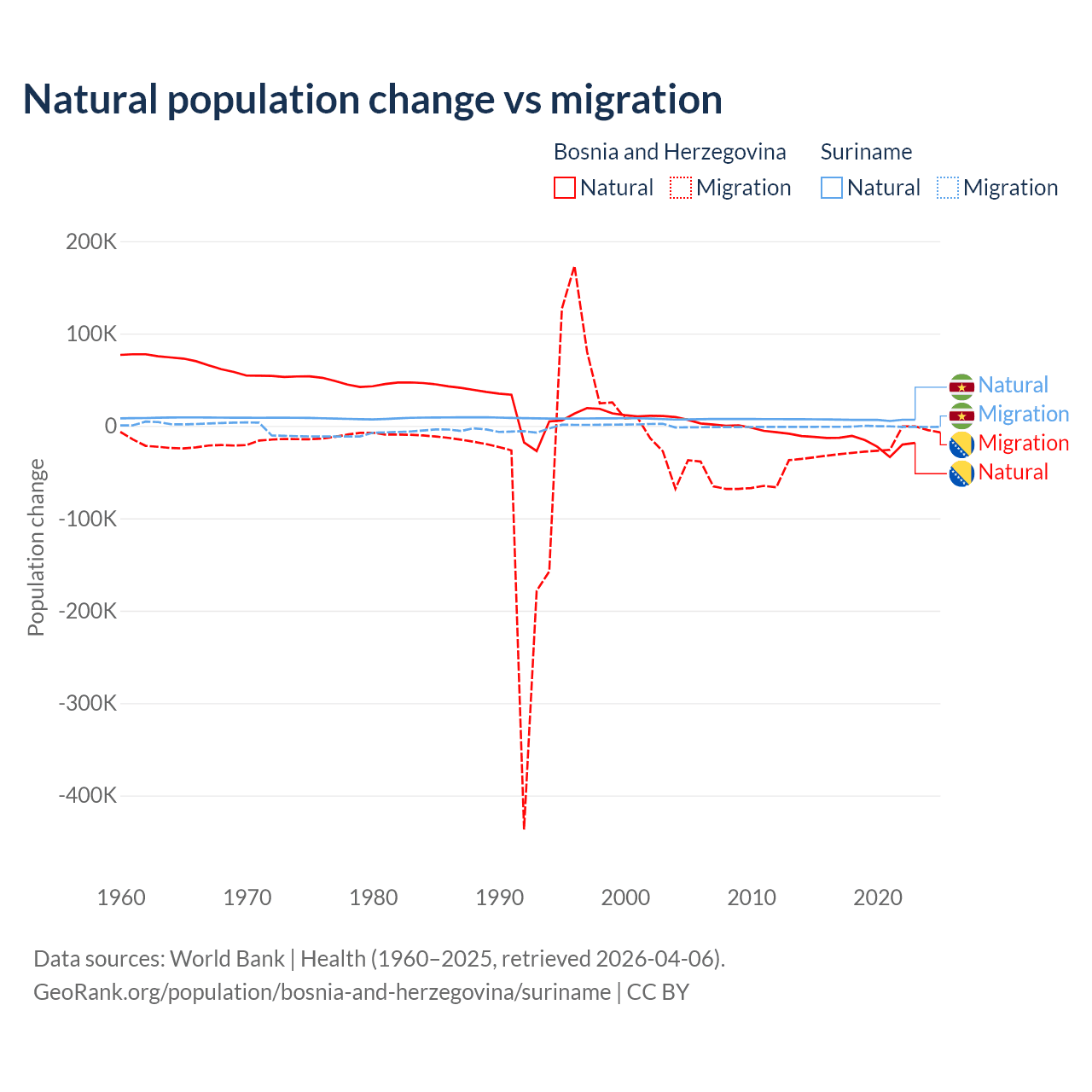Over the last 10 years, 41.1% of the population change in Bosnia and Herzegovina is from natural causes (a loss of 169,384 people) and 58.9% is from migration (a loss of 243,117 people). In Suriname 90.3% is from natural causes (a gain of 66,709 people) and 9.72% is from migration (a loss of 7,185 people).