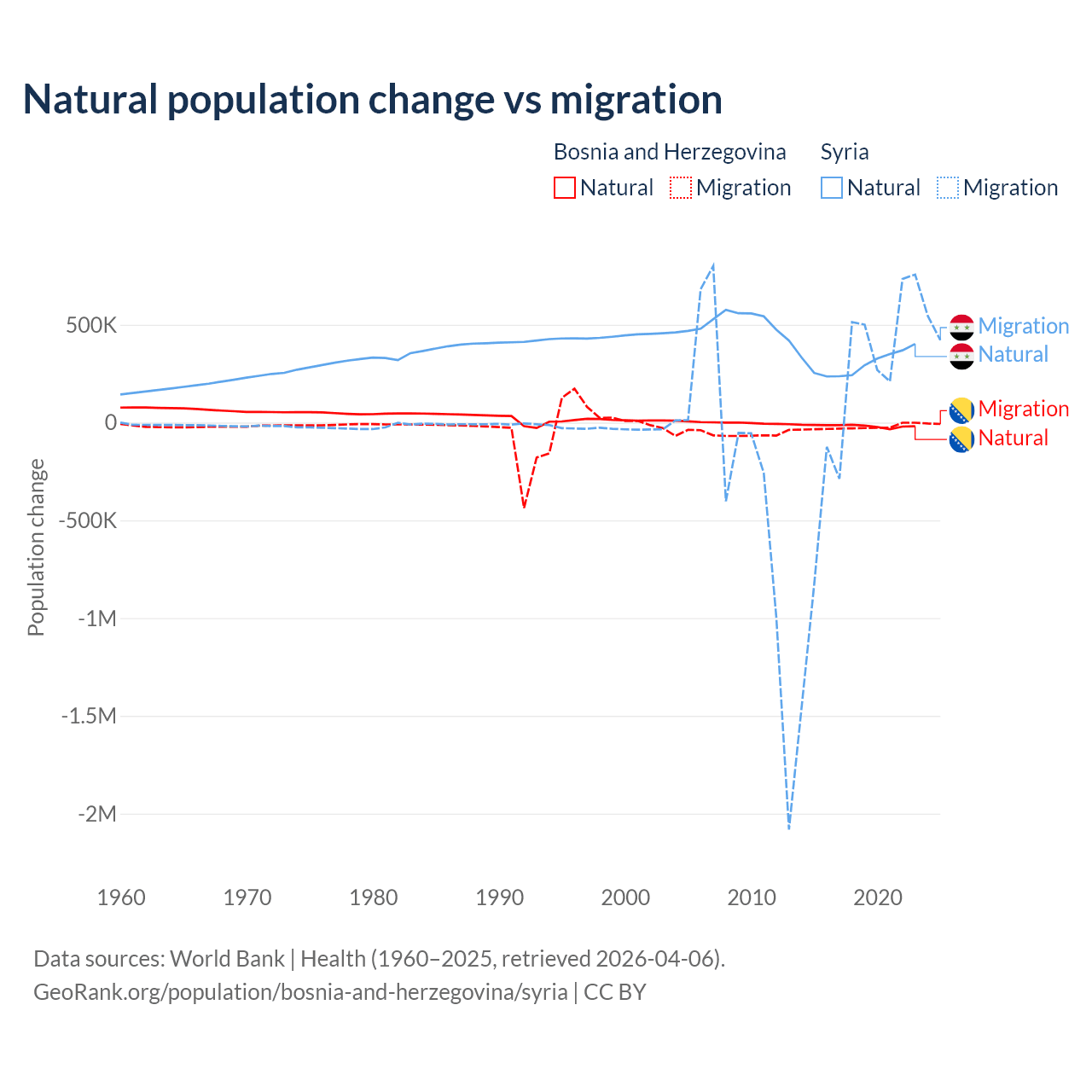 Over the last 10 years, 41.1% of the population change in Bosnia and Herzegovina is from natural causes (a loss of 169,384 people) and 58.9% is from migration (a loss of 243,117 people). In Syria 91.3% is from natural causes (a gain of 3,047,621 people) and 8.72% is from migration (a gain of 291,069 people).