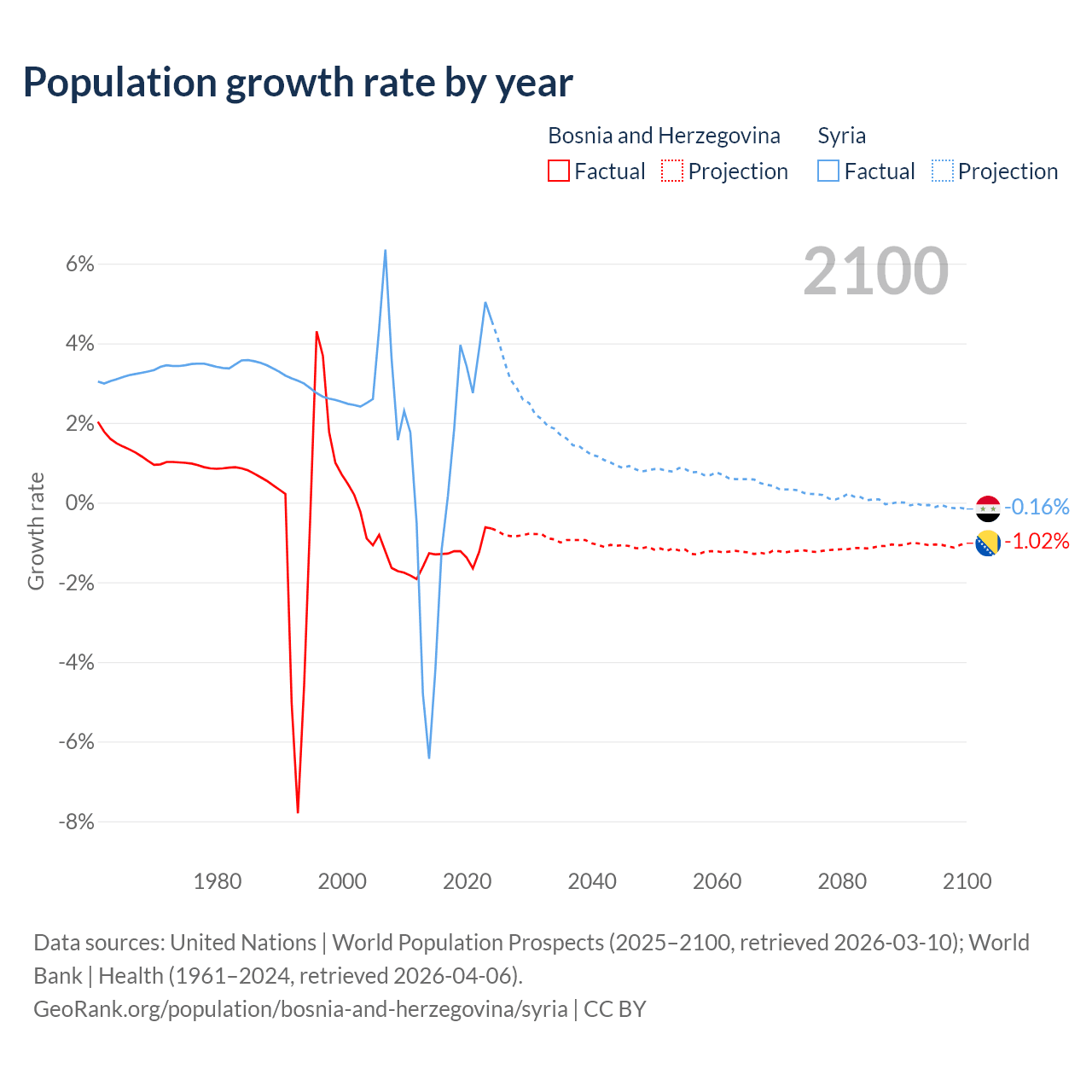 - For the last 10 years, Bosnia and Herzegovina has had an average growth rate of -1.19% per year vs +1.25% in Syria.