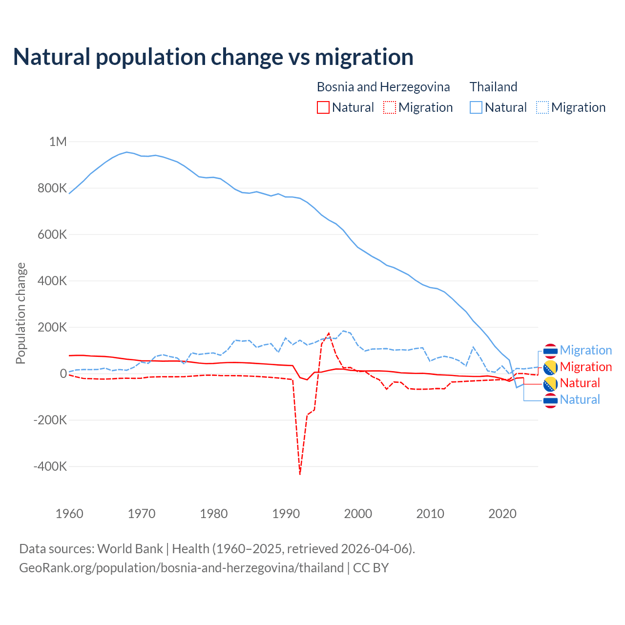 Over the last 10 years, 41.1% of the population change in Bosnia and Herzegovina is from natural causes (a loss of 169,384 people) and 58.9% is from migration (a loss of 243,117 people). In Thailand 78.4% is from natural causes (a gain of 1,292,528 people) and 21.6% is from migration (a gain of 355,361 people).