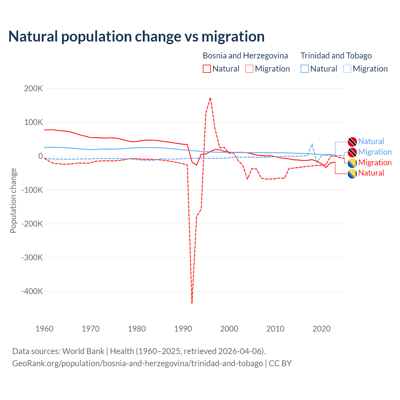 Over the last 10 years, 41.1% of the population change in Bosnia and Herzegovina is from natural causes (a loss of 169,384 people) and 58.9% is from migration (a loss of 243,117 people). In Trinidad and Tobago 66% is from natural causes (a gain of 55,887 people) and 34% is from migration (a gain of 28,785 people).
