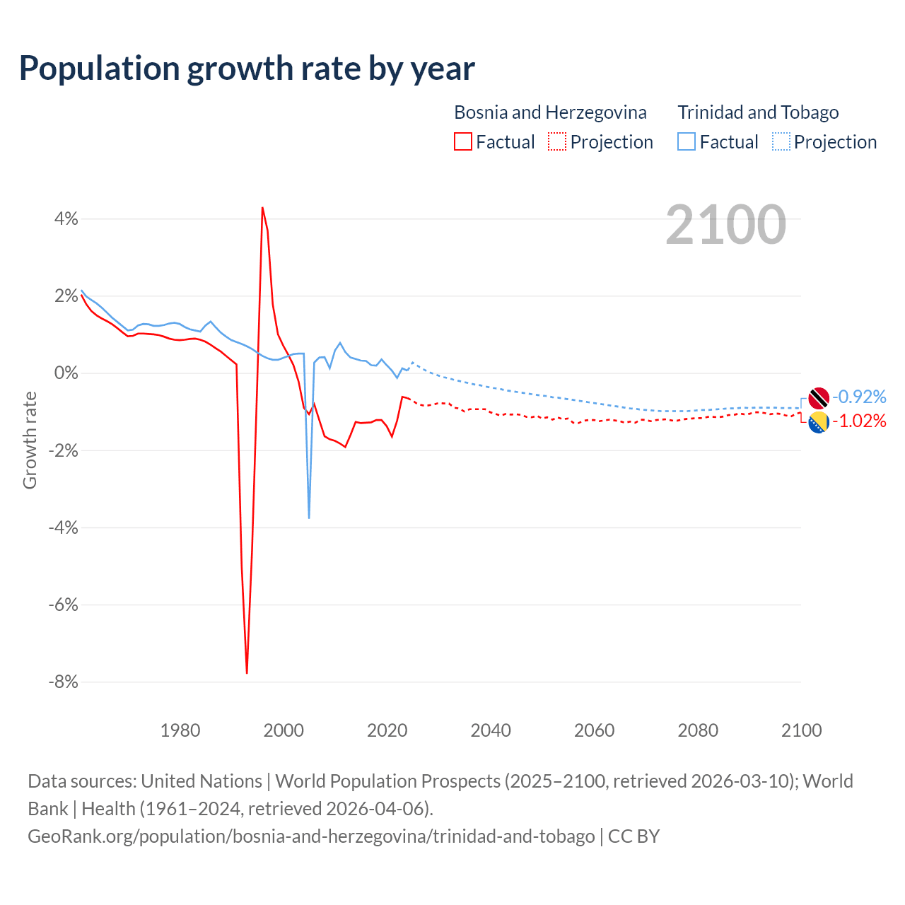 - For the last 10 years, Bosnia and Herzegovina has had an average growth rate of -1.19% per year vs +0.19% in Trinidad and Tobago.