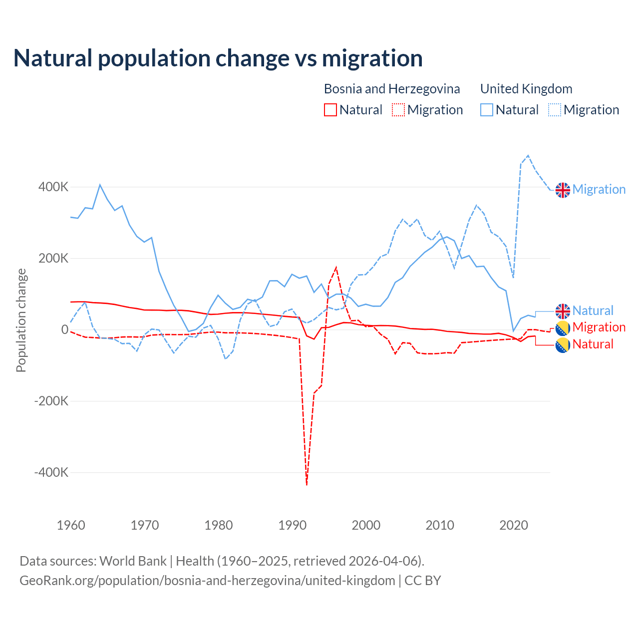 Over the last 10 years, 41.1% of the population change in Bosnia and Herzegovina is from natural causes (a loss of 169,384 people) and 58.9% is from migration (a loss of 243,117 people). In the United Kingdom 23.9% is from natural causes (a gain of 1,033,129 people) and 76.1% is from migration (a gain of 3,283,101 people).