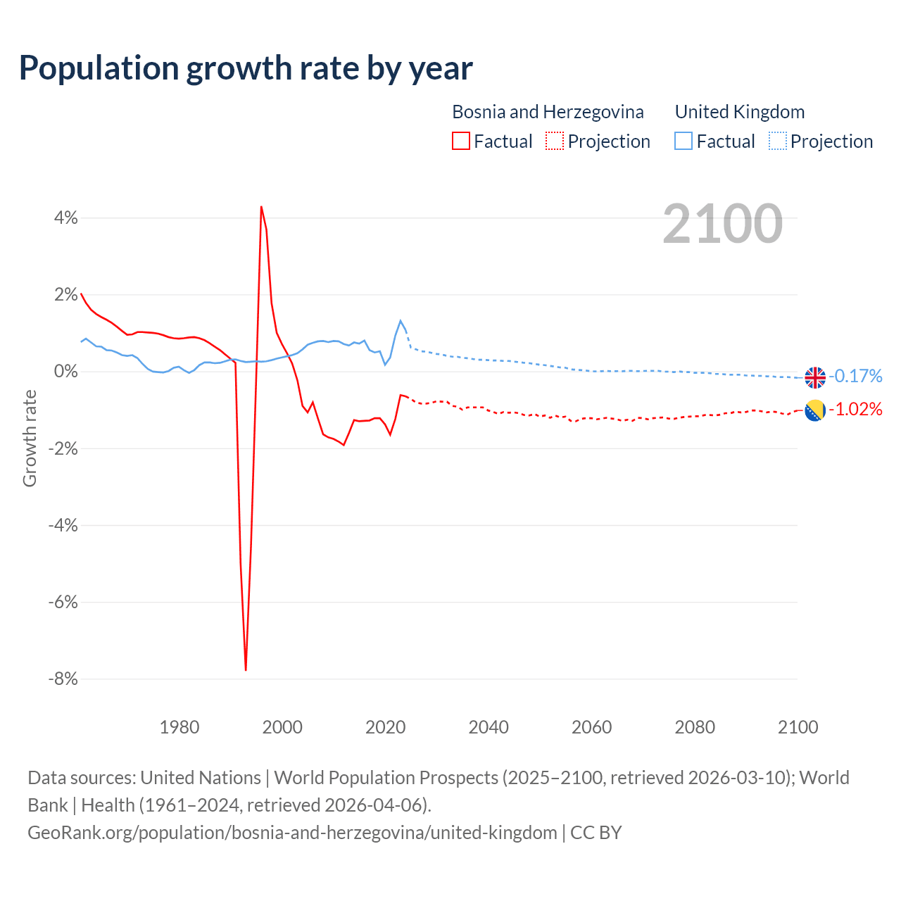- For the last 10 years, Bosnia and Herzegovina has had an average growth rate of -1.19% per year vs +0.7% in the United Kingdom.