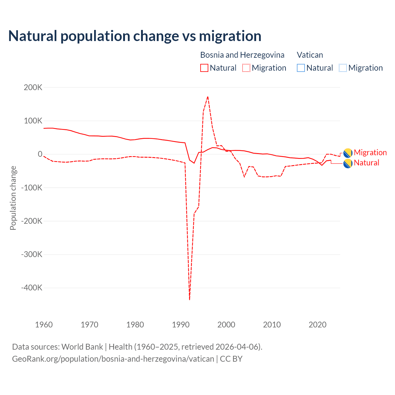 - Since 2006, the population of Bosnia and Herzegovina has decreased from 4.06M people to 3.12M (23.3% decline), while the Vatican has grown from 932 to 936 (0.43% growth).