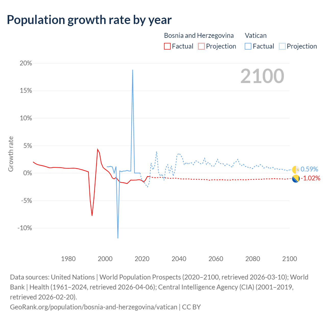 - For the last 10 years, Bosnia and Herzegovina has had an average growth rate of -1.19% per year vs +1.9% in the Vatican.