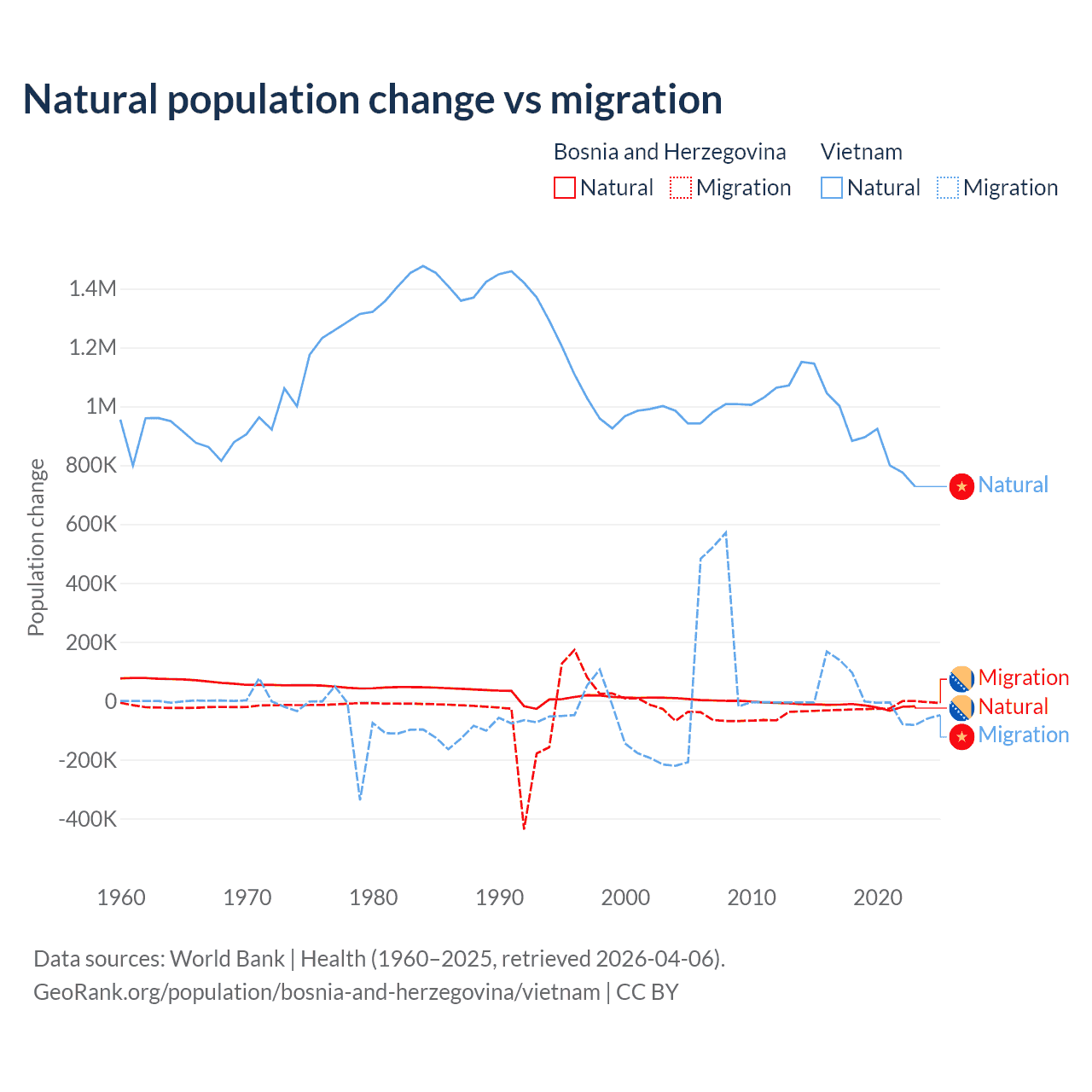 Over the last 10 years, 41.1% of the population change in Bosnia and Herzegovina is from natural causes (a loss of 169,384 people) and 58.9% is from migration (a loss of 243,117 people). In Vietnam 97.7% is from natural causes (a gain of 9,349,756 people) and 2.29% is from migration (a gain of 219,073 people).