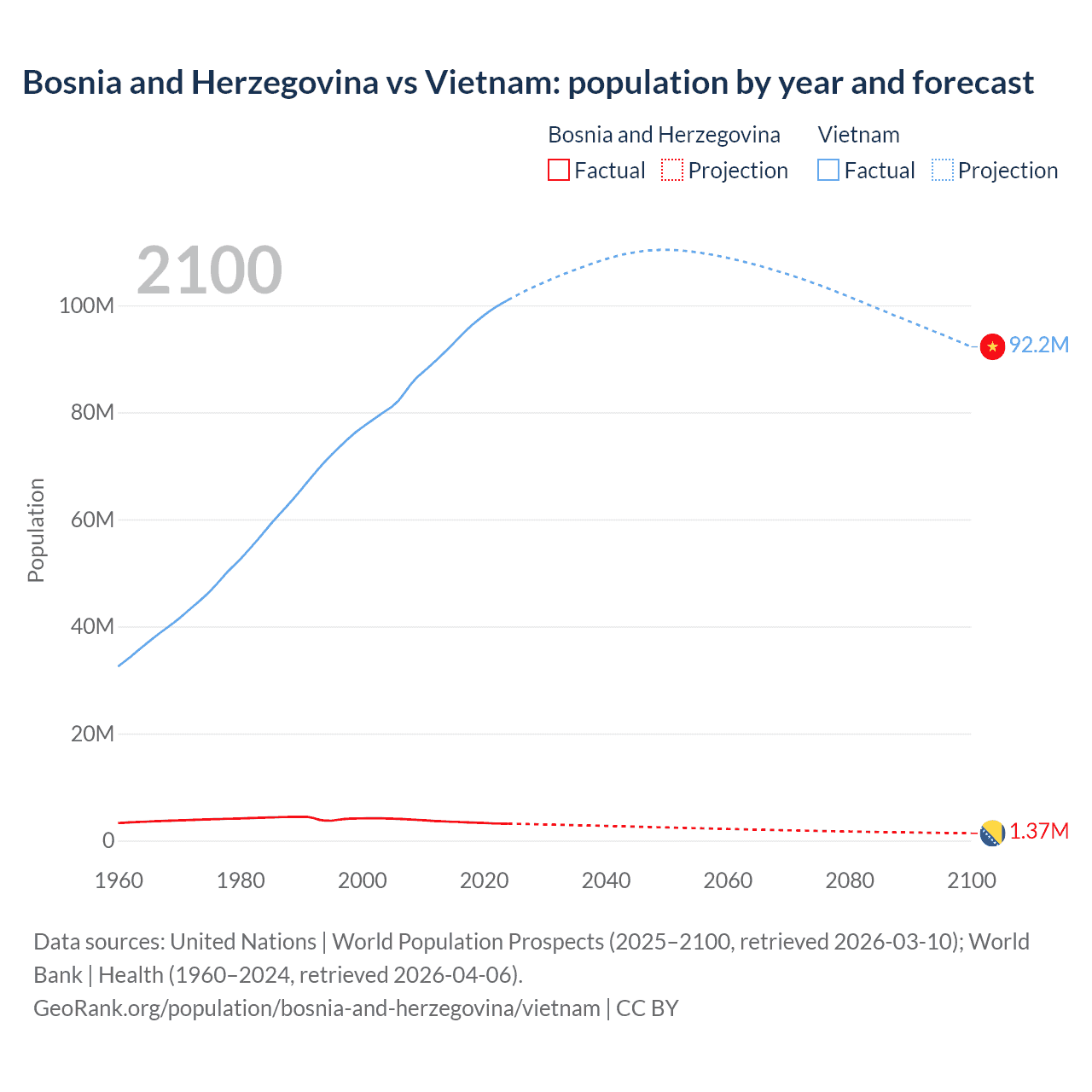 Bosnia and Herzegovina vs Vietnam: population by year and forecast