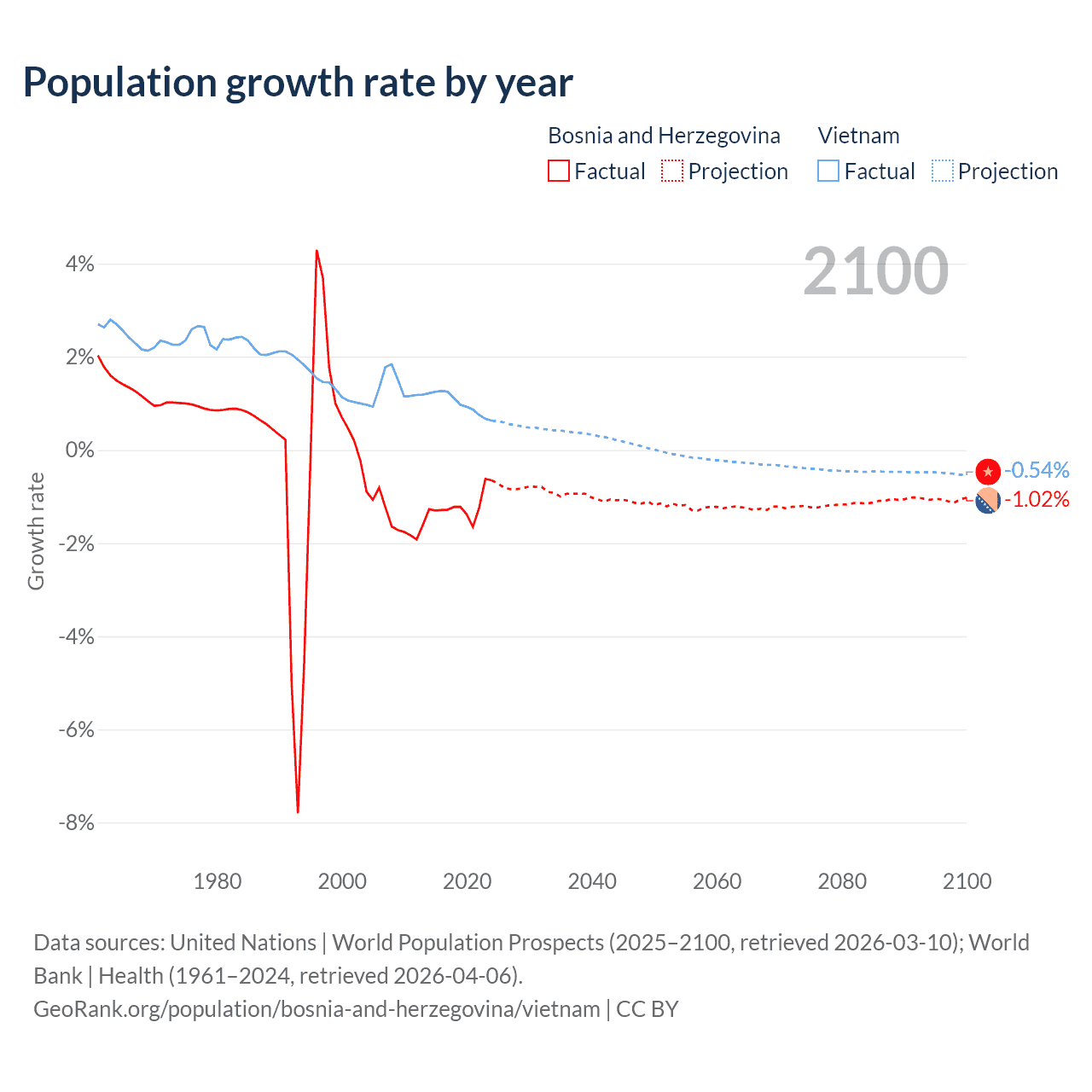 - For the last 10 years, Bosnia and Herzegovina has had an average growth rate of -1.19% per year vs +0.99% in Vietnam.