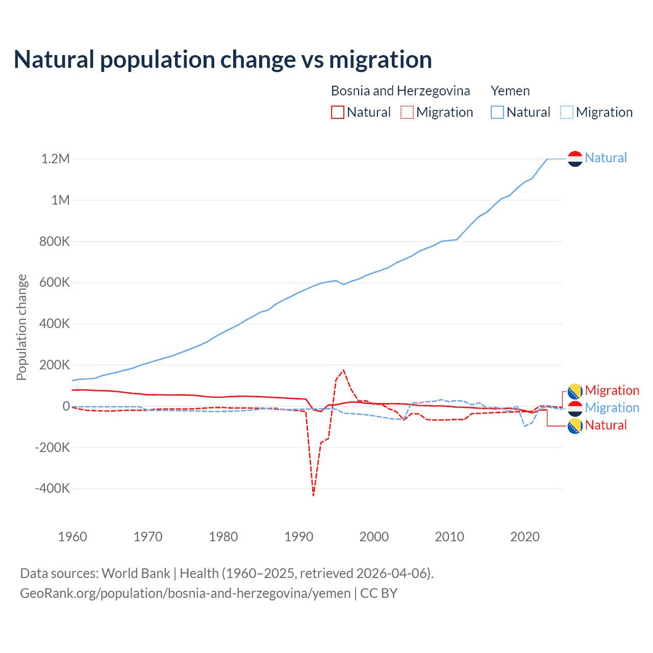 Over the last 10 years, 41.1% of the population change in Bosnia and Herzegovina is from natural causes (a loss of 169,384 people) and 58.9% is from migration (a loss of 243,117 people). In Yemen 97.8% is from natural causes (a gain of 10,460,813 people) and 2.17% is from migration (a loss of 231,814 people).