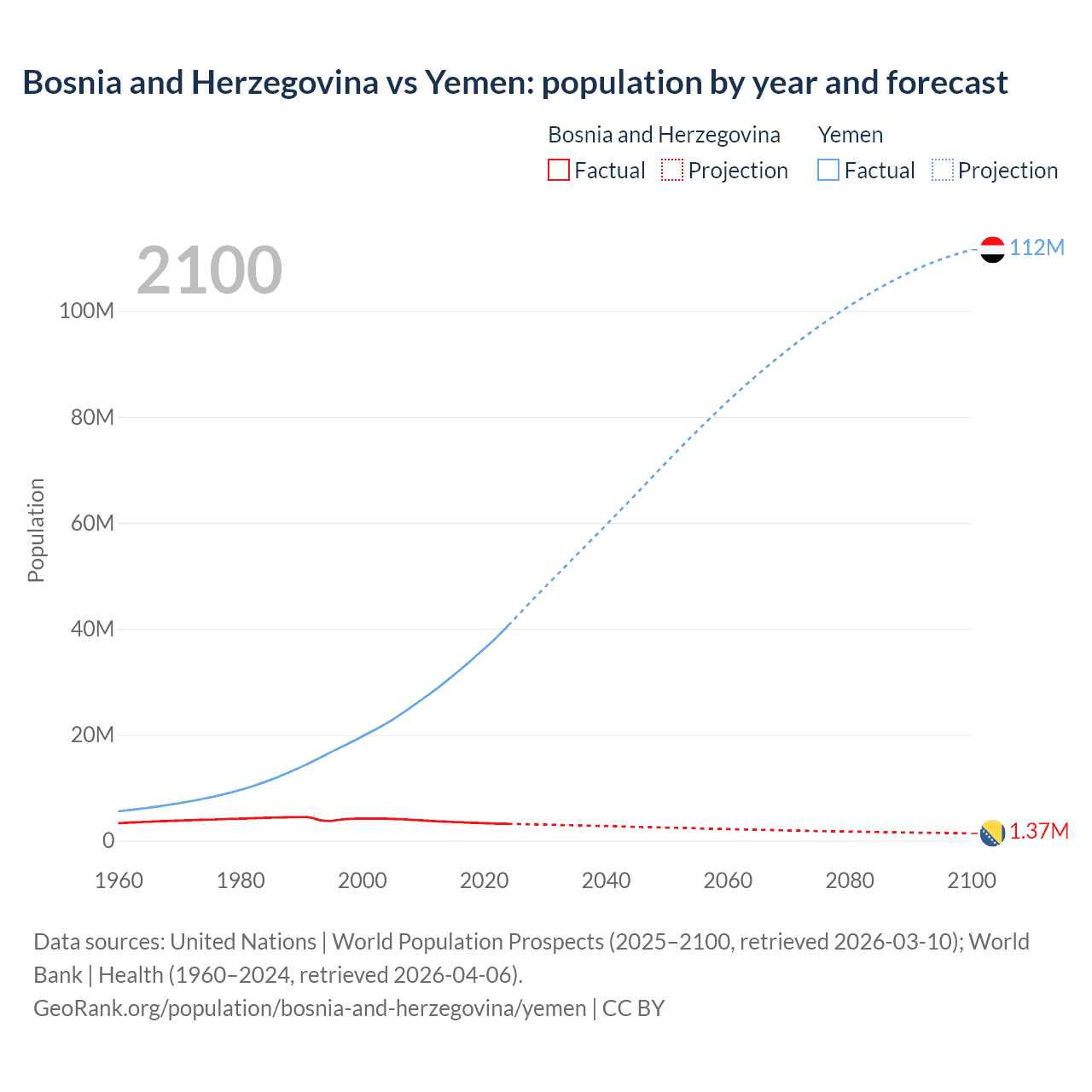 Bosnia and Herzegovina vs Yemen: population by year and forecast