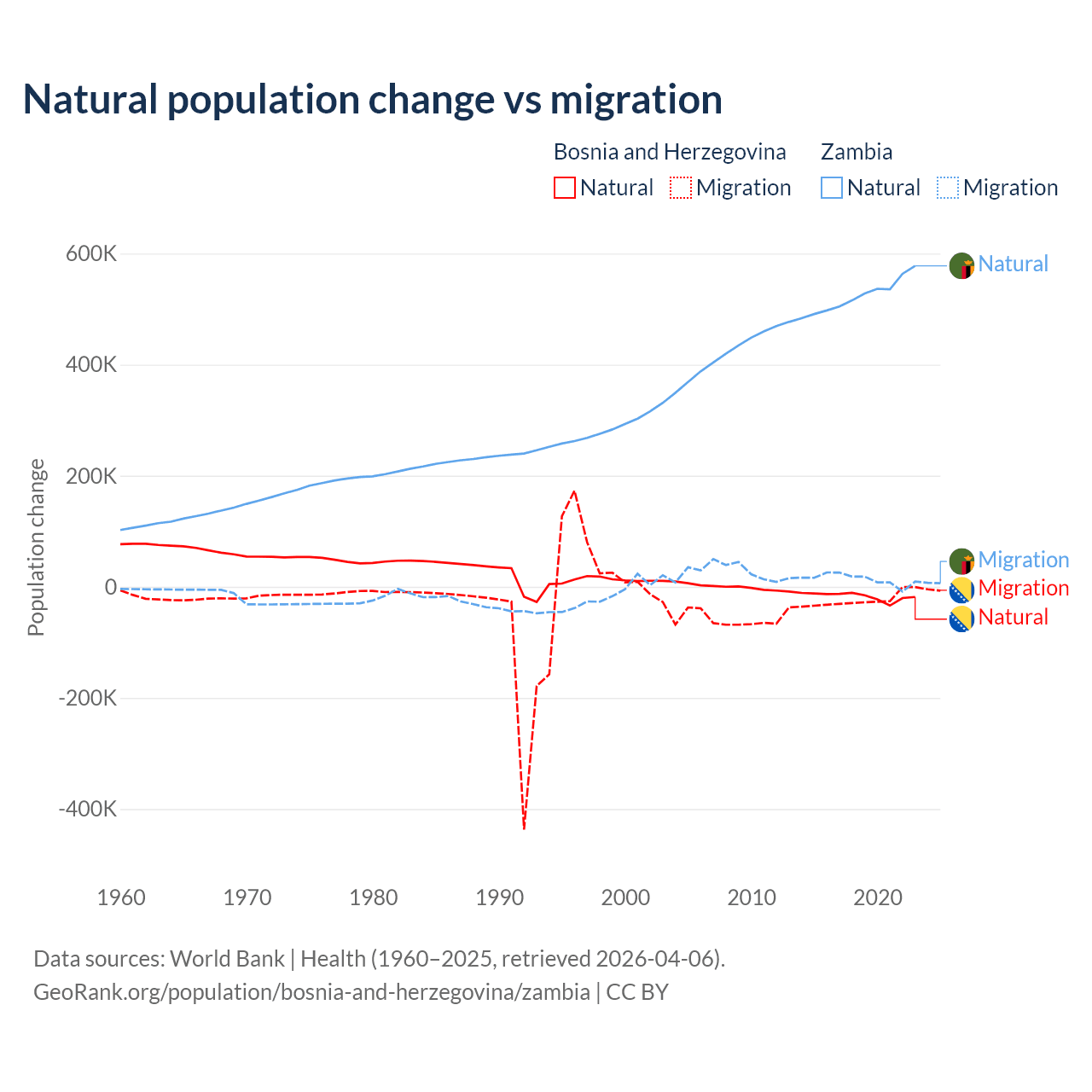 Over the last 10 years, 41.1% of the population change in Bosnia and Herzegovina is from natural causes (a loss of 169,384 people) and 58.9% is from migration (a loss of 243,117 people). In Zambia 97.4% is from natural causes (a gain of 5,233,797 people) and 2.58% is from migration (a gain of 138,554 people).