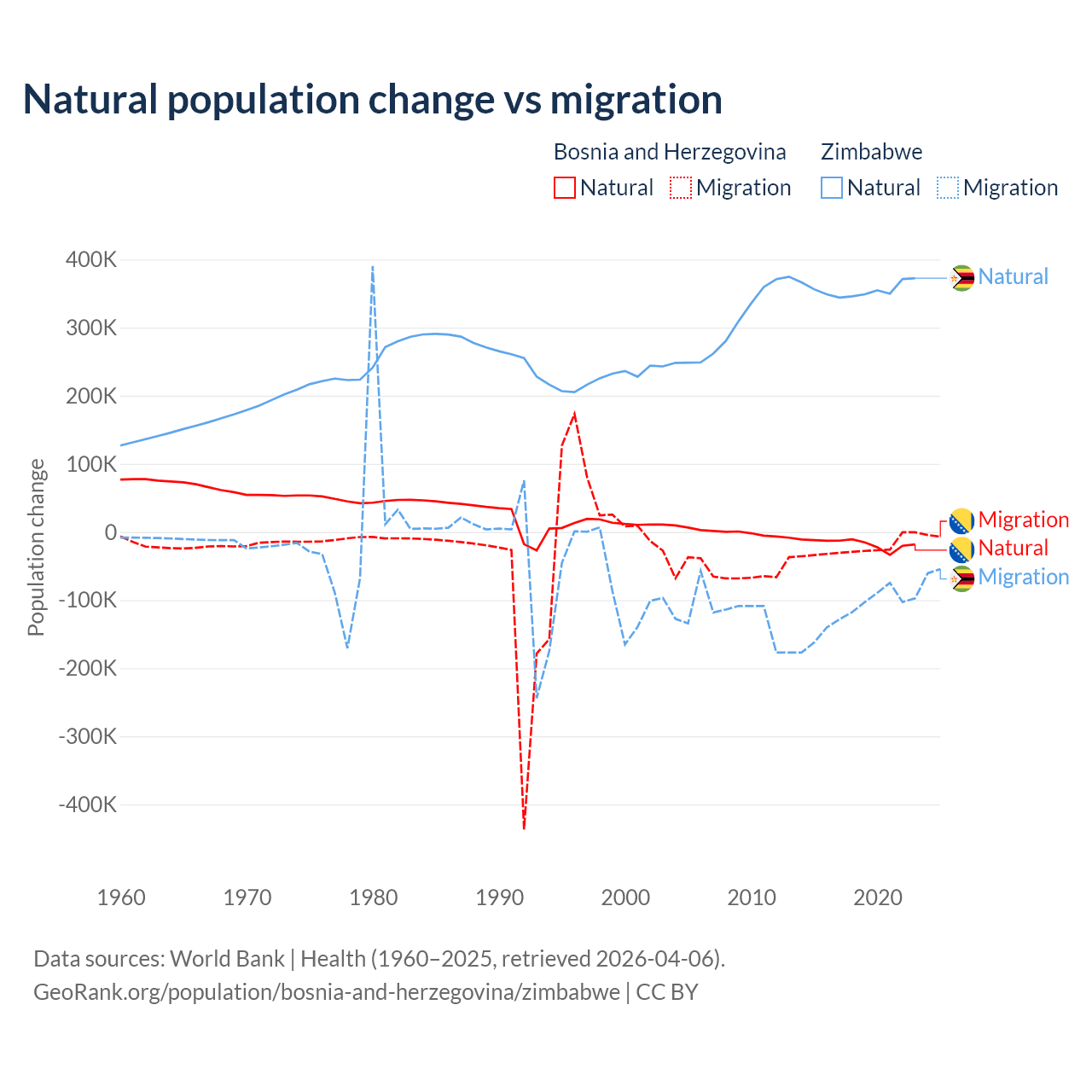 Over the last 10 years, 41.1% of the population change in Bosnia and Herzegovina is from natural causes (a loss of 169,384 people) and 58.9% is from migration (a loss of 243,117 people). In Zimbabwe 74.9% is from natural causes (a gain of 3,558,487 people) and 25.1% is from migration (a loss of 1,192,807 people).