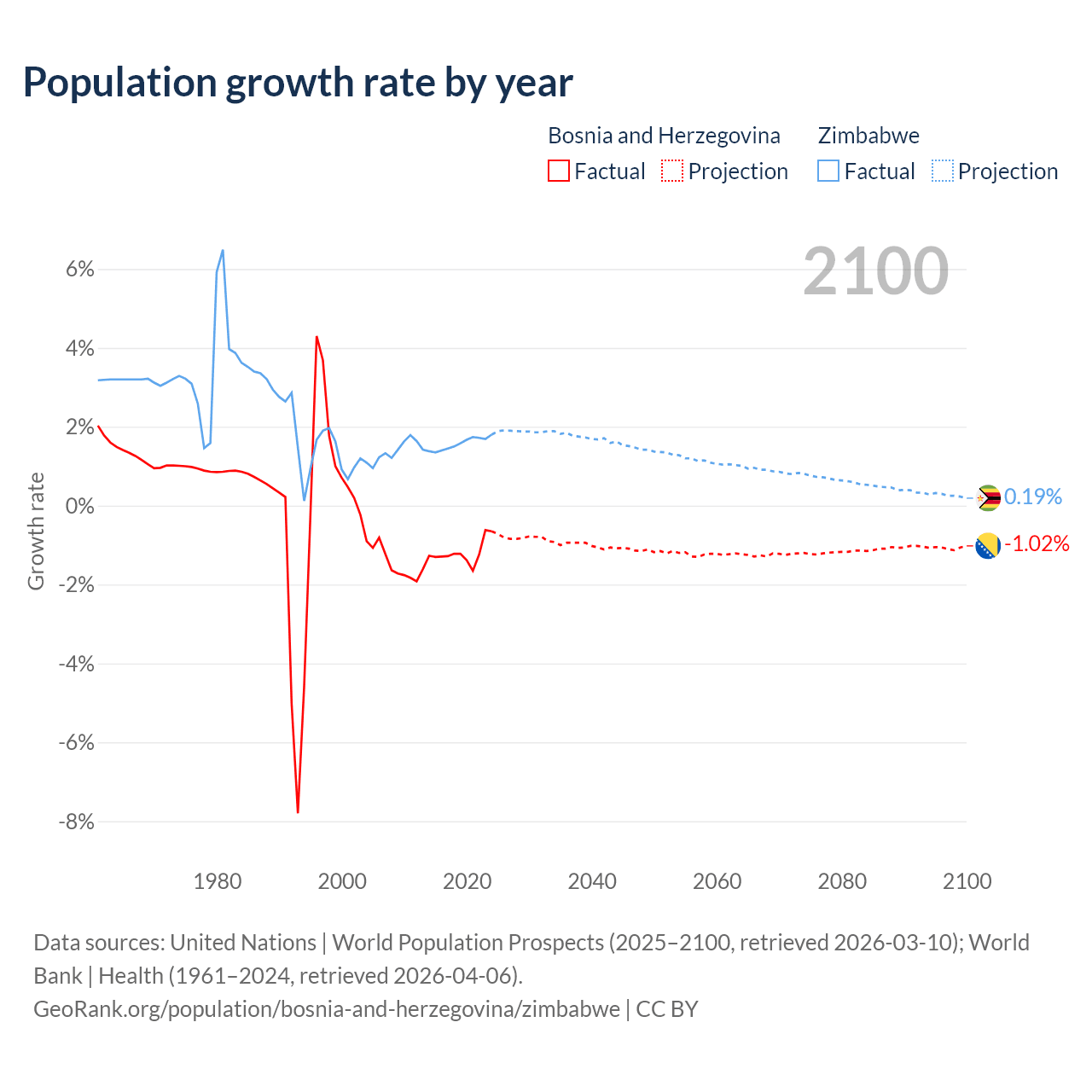 - For the last 10 years, Bosnia and Herzegovina has had an average growth rate of -1.19% per year vs +1.57% in Zimbabwe.