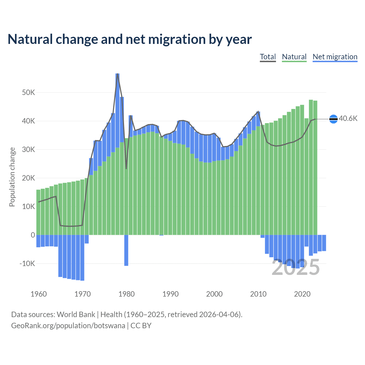 Over the last 10 years, 82.5% of the population change in Botswana is from natural causes (a gain of 436,373 people) and 17.5% is from migration (a loss of 92,293 people).