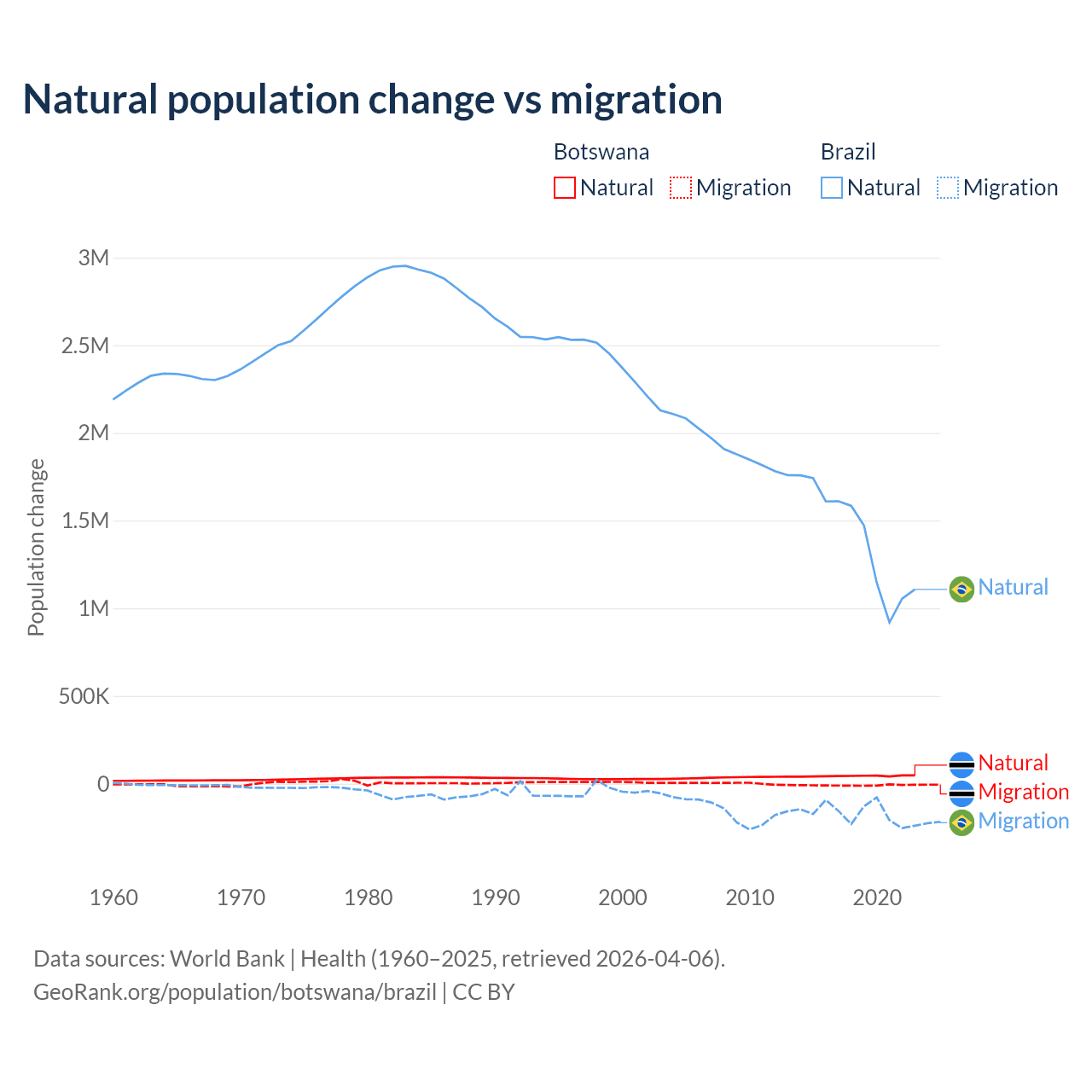 Over the last 10 years, 82.5% of the population change in Botswana is from natural causes (a gain of 436,373 people) and 17.5% is from migration (a loss of 92,293 people). In Brazil 89.1% is from natural causes (a gain of 14,004,164 people) and 10.9% is from migration (a loss of 1,708,894 people).
