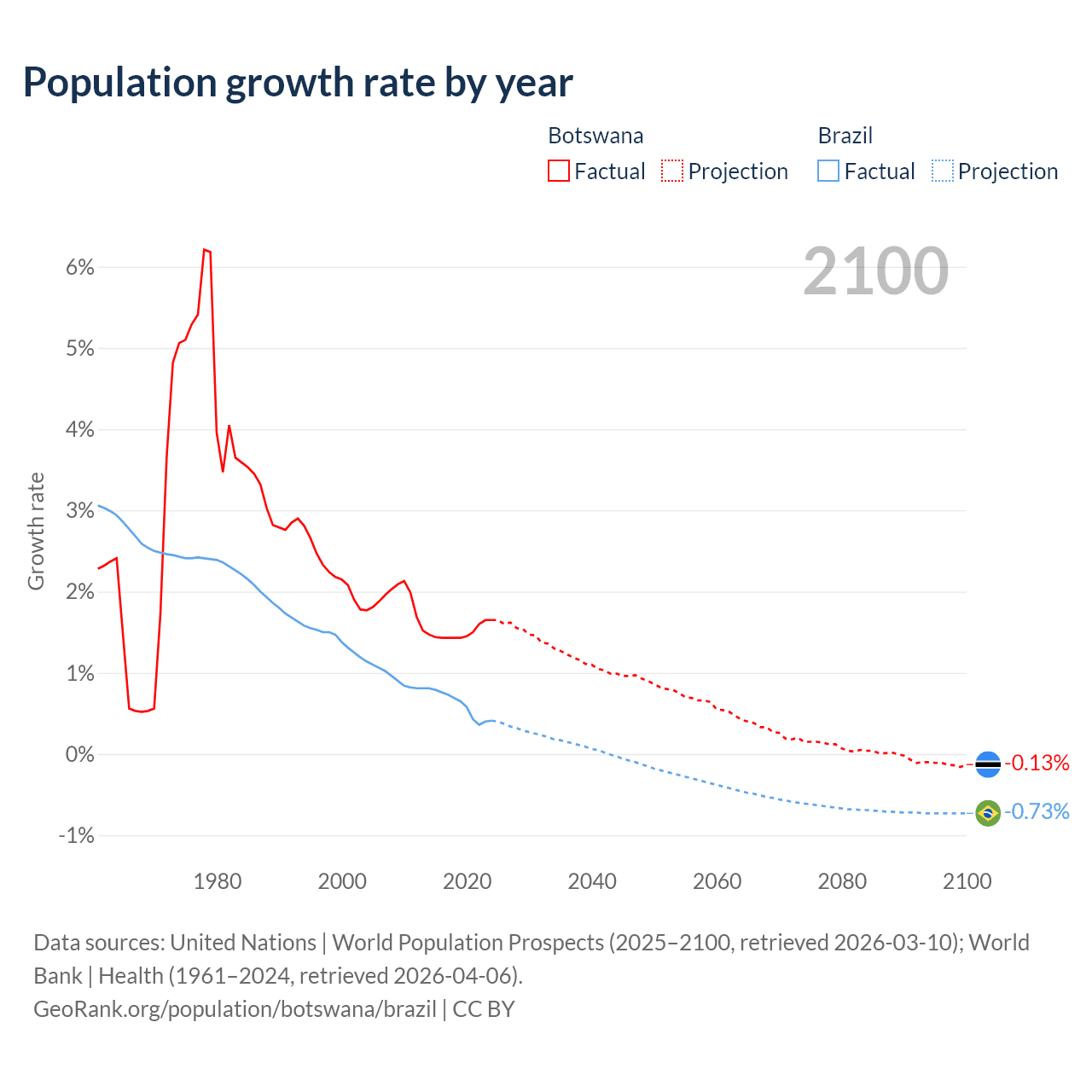 - For the last 10 years, Botswana has had an average growth rate of +1.5% per year vs +0.6% in Brazil.