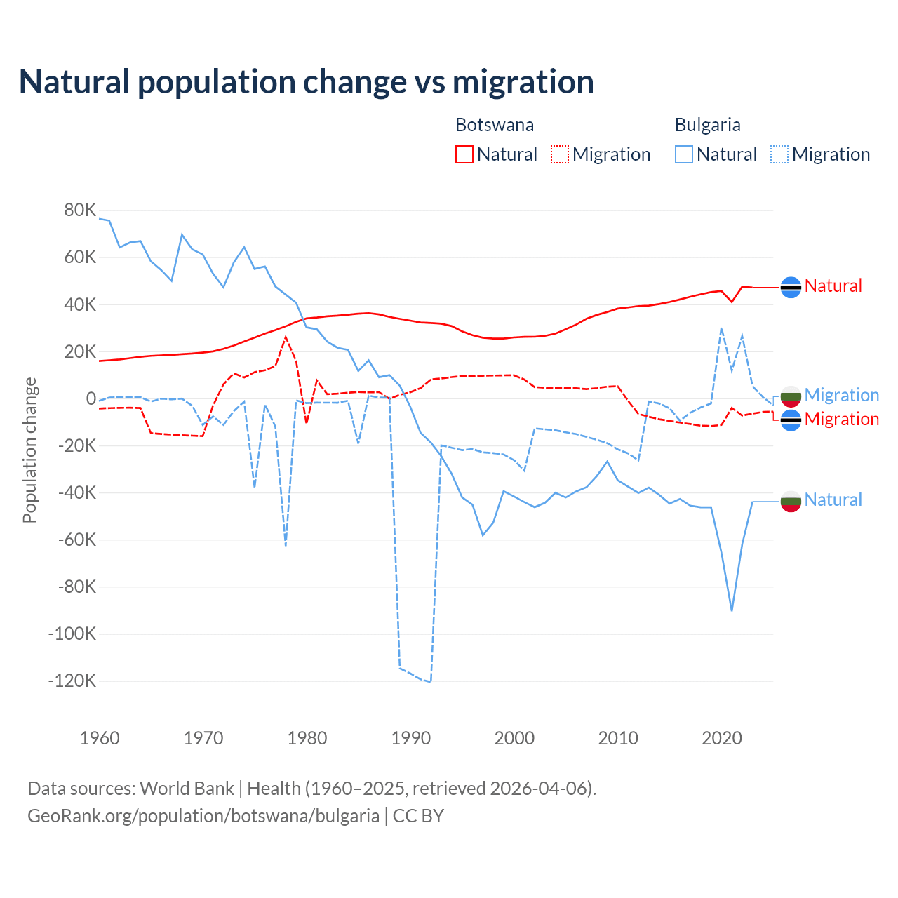 Over the last 10 years, 82.5% of the population change in Botswana is from natural causes (a gain of 436,373 people) and 17.5% is from migration (a loss of 92,293 people). In Bulgaria 92.1% is from natural causes (a loss of 528,535 people) and 7.94% is from migration (a gain of 45,567 people).