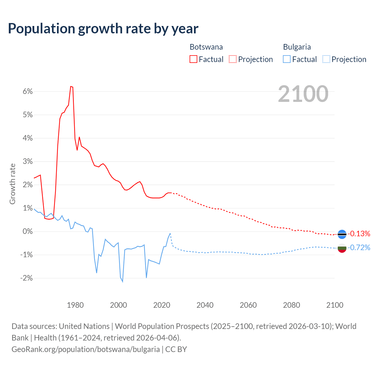 - For the last 10 years, Botswana has had an average growth rate of +1.5% per year vs -0.96% in Bulgaria.